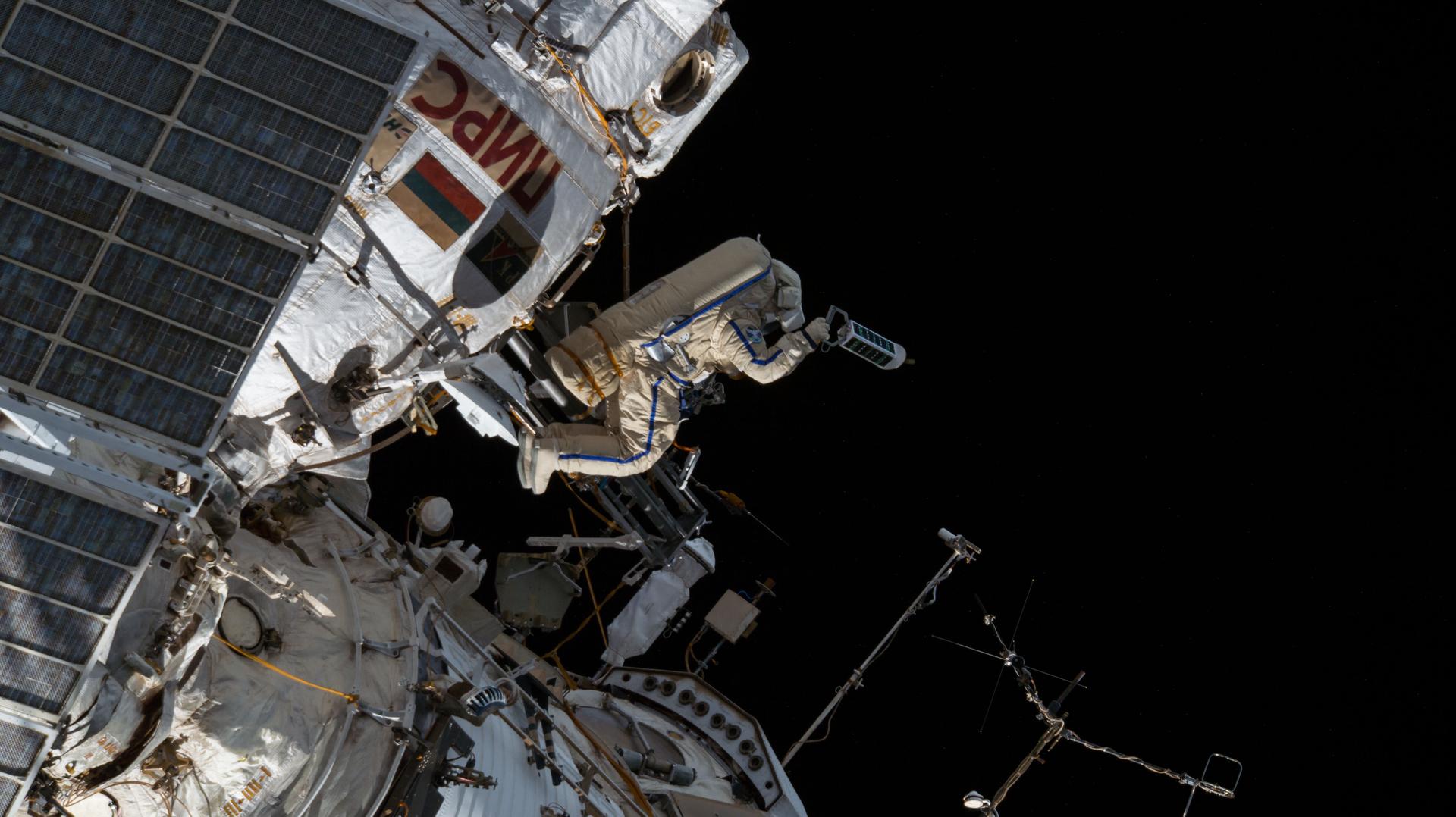 iss056e139456 (Aug. 15, 2018) --- Roscosmos cosmonaut Sergey Prokopyev hand-deploys one of two Tanyusha nano-satellites just outside of the Pirs docking compartment airlock during a spacewalk that lasted 7 hours 46 minutes. Fellow cosmonaut Oleg Artemyev (out of frame) joined Prokopyev during the spacewalk which also saw the installation of the Icarus animal-tracking experiment and the retrieval of a materials exposure experiment on the Russian segment of the International Space Station.