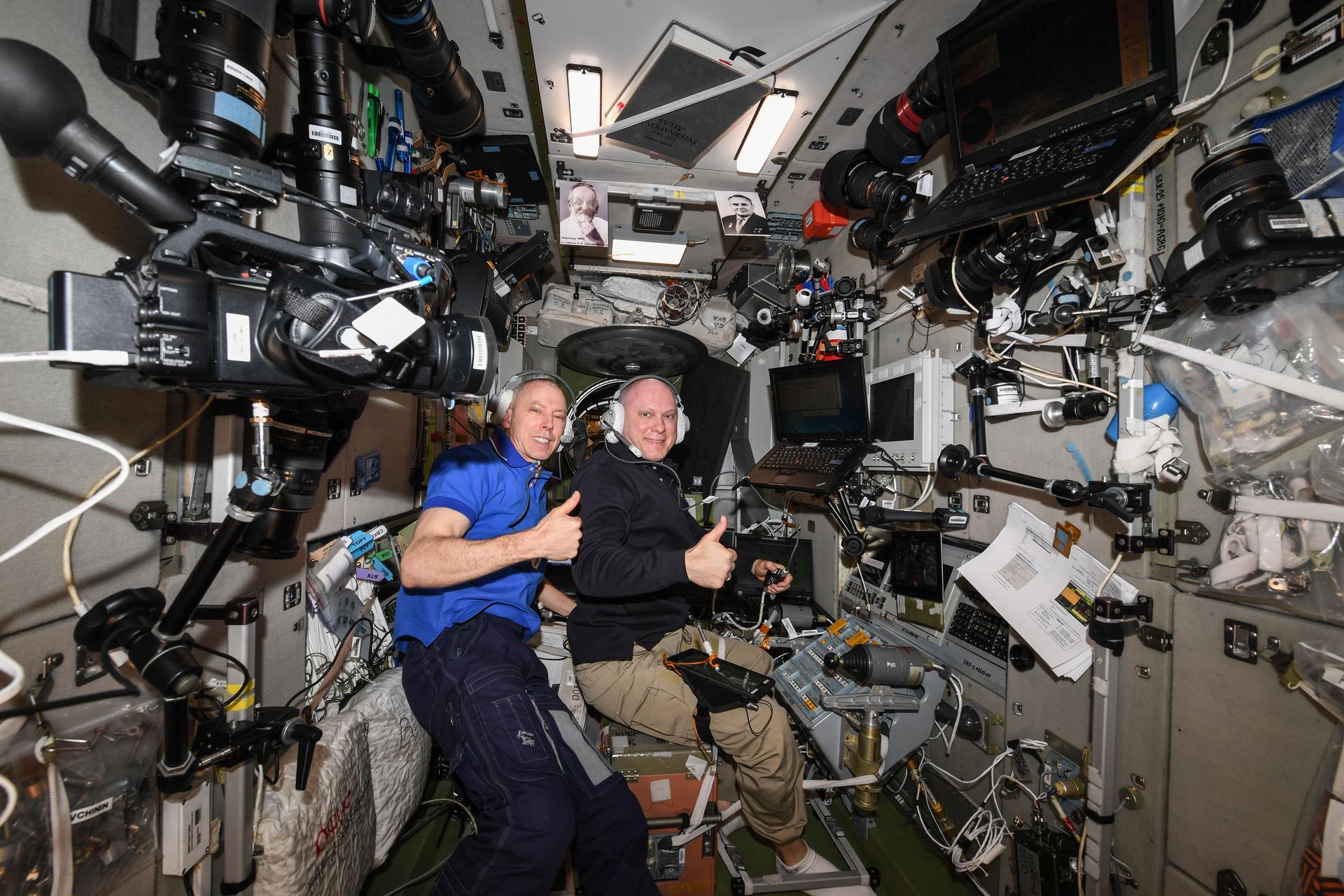 iss056e186451 (Sept. 24, 2018) --- (From left) Expedition 56 Commander Drew Feustel of NASA and Soyuz MS-08 Commander Oleg Artemyev of Roscosmos practice on a computer the Soyuz descent procedures they will use when they return to Earth on Oct. 4. NASA astronaut Ricky Arnold (out of frame) will join the duo for the ride home inside the Soyuz MS-08 spacecraft ending the Expedition 56 mission.