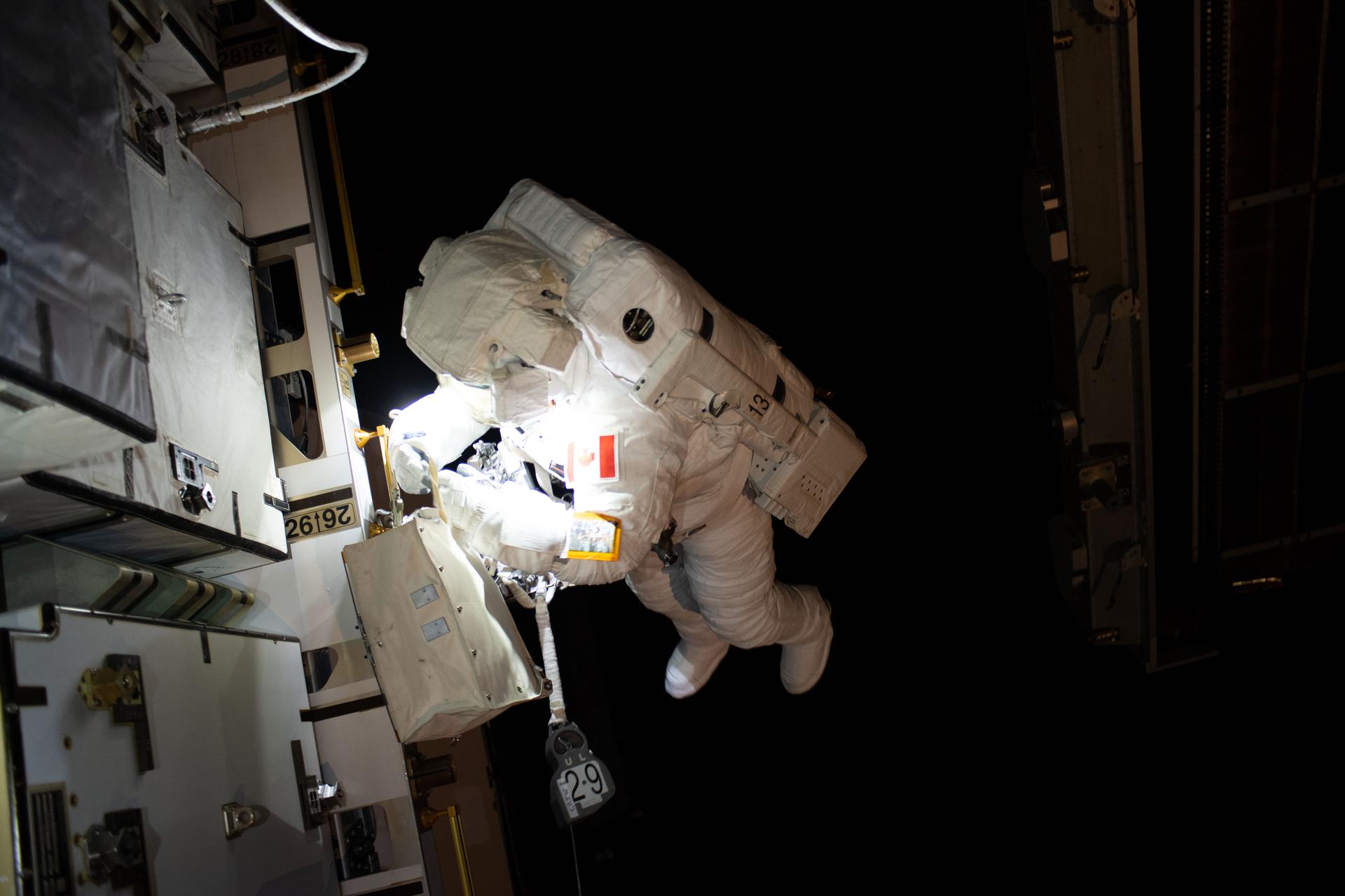 iss059e016830 (April 8, 2019) --- Expedition 59 Flight Engineer David Saint-Jacques of the Canadian Space Agency is seen working to relocate a battery adapter plate outside the International Space Station. In a six and a half hour spacewalk, Saint-Jacques and NASA astronaut Anne McClain successfully established a redundant path of power to the Canadian-built robotic arm, known as Canadarm2, and installed cables to provide for more expansive wireless communications coverage outside the orbital complex, as well as for enhanced hardwired computer network capability. The duo also relocated an adapter plate from the first spacewalk in preparation for future battery upgrade operations.