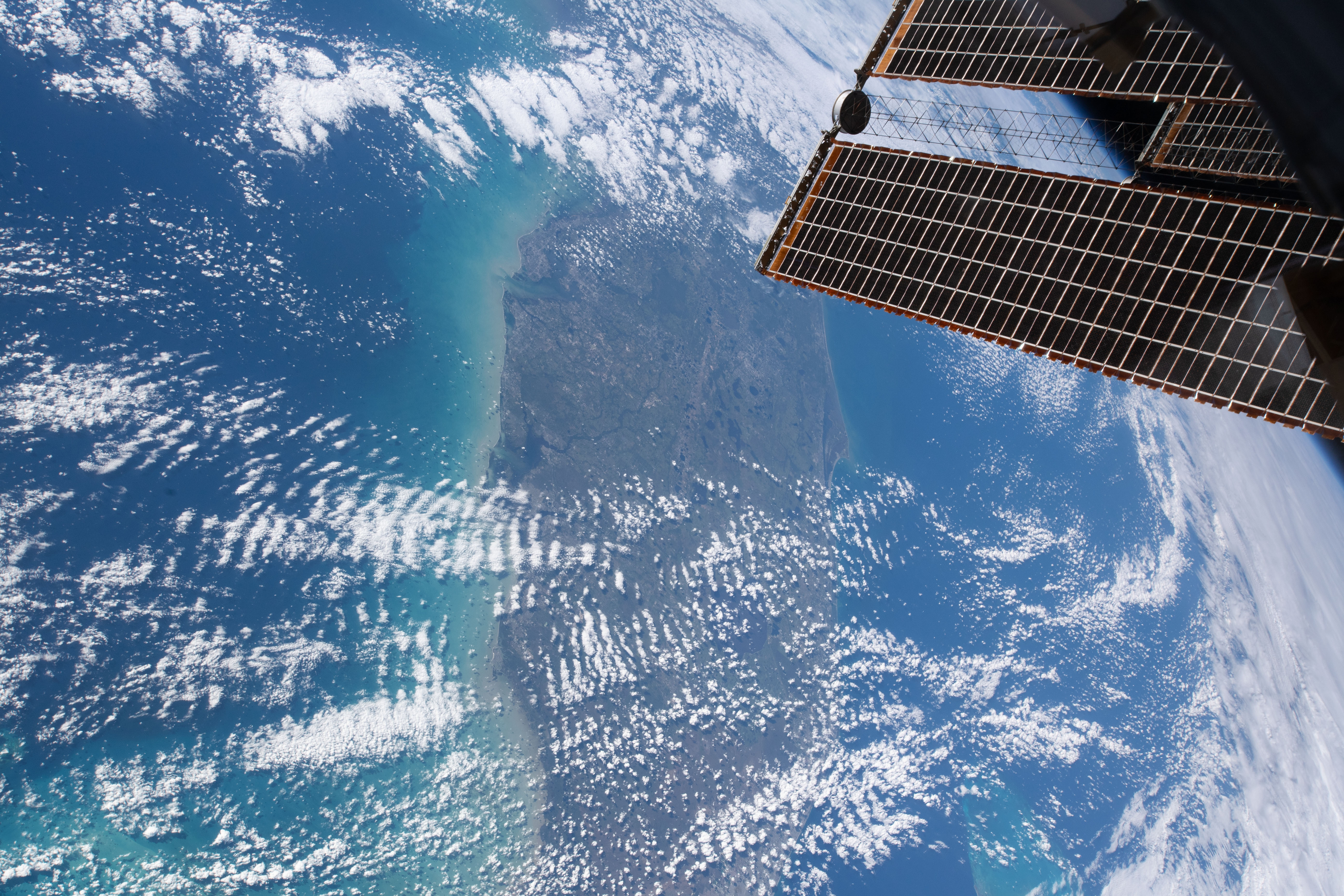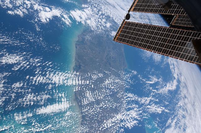 iss059e027945 (April 20, 2019) --- The state of Florida, with the Gulf of Mexico on its east coast, the Atlantic Ocean on its west coast and the International Space Station's solar arrays in the foreground are pictured as the orbital complex flew 254 miles above Earth's surface.