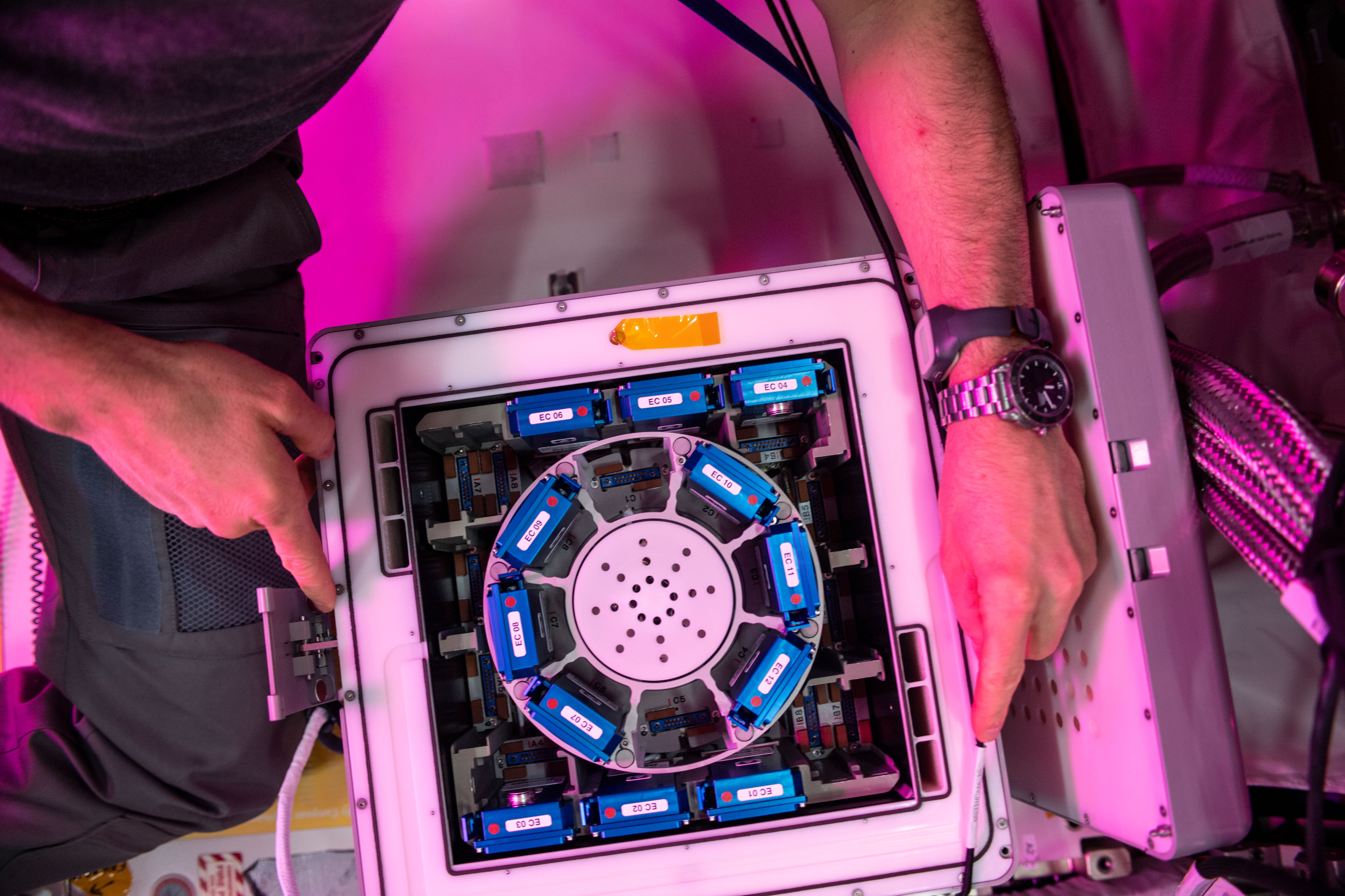 iss059e059071 (5/7/2019) --- Photo documentation of the 12 Nano Antioxidants Experiment Containers in Kubik 5 marking the start of the experiment run in the Columbus module aboard the International Space Station (ISS). The aim of the Nano Antioxidants investigation is to research innovative approaches for cellular stimulation to counteract the negative effects of long-term microgravity on the musculoskeletal system. There are numerous possible applications of this research project in other crucial social domains, such as healthcare of the elderly and of people with muscle atrophy disorders, through the implementation of new therapeutic strategies in the treatment of diseases involving oxidative stress as causing factor.