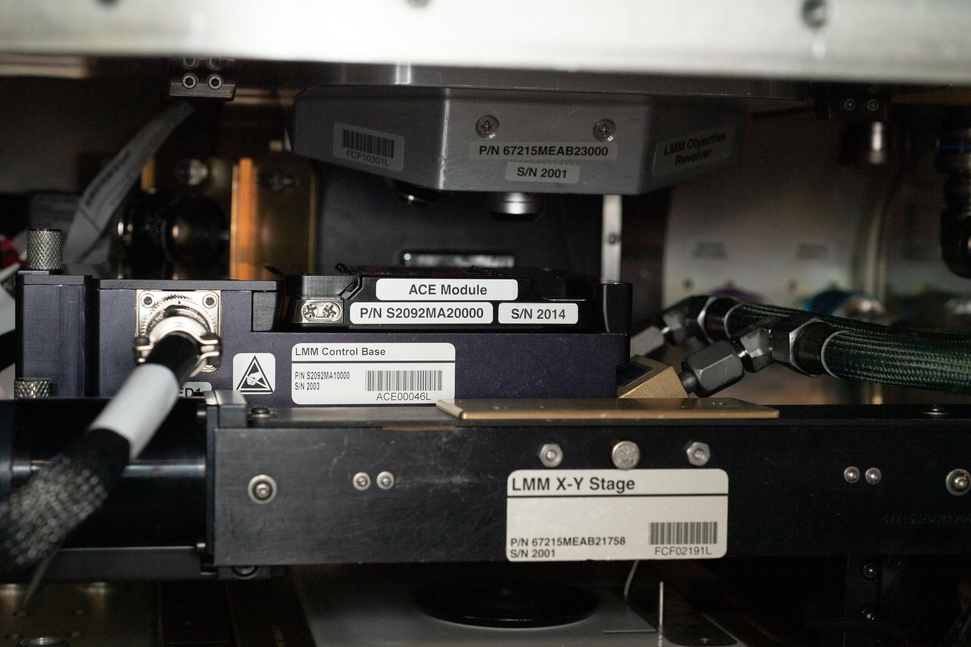 iss059e101468 (6/12/2019) — Photo documentation aboard the International Space Station (ISS) of the ACE modules taken in the the Light Microscopy Module (LMM) during the ACE-T10 Module Configuration. The Advanced Colloids Experiment-Temperature-10 (ACE-T-10) investigates the growth kinetics, microscopic dynamics, and restructuring processes in ordered and disordered structures such as colloidal crystals, glasses and gels. The investigation studies crystal nucleation in colloidal fluids, the origin of ageing in glasses and gels, as well as the heterogeneous nature of the microscopic dynamics in these structures. The study must be conducted in microgravity, as gravitational stresses affect the structure and growth of these solids from colloids.