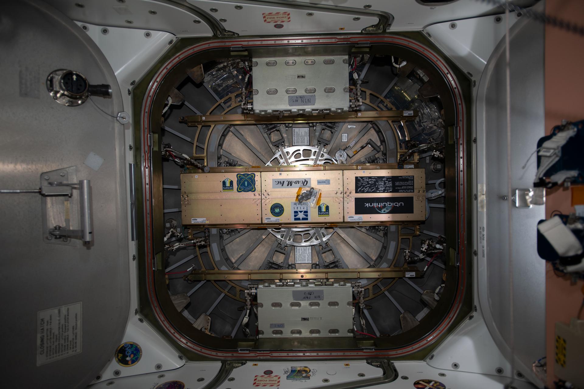 iss060e021430 (8/5/2019) --- Photo documentation of Slingshot mounted on the Passive Common Berthing Mechanism (PCBM) of the NG-11 Cygnus which is berthed to the International Space Station (ISS). SEOPS’ SlingShot is a small satellite deployment system that fits inside the Cygnus spacecraft’s Passive Common Berthing Mechanism (PCBM). SlingShot can accommodate up to 18 satellites that are deployed post Cygnus unberth.