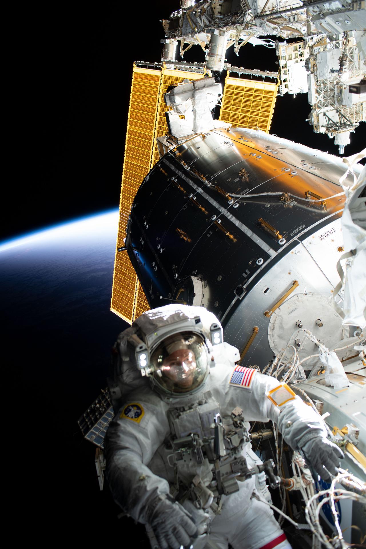 iss060e043273 (Aug. 21, 2019) --- NASA astronaut Nick Hague is pictured tethered to the forward end of the International Space Station during a spacewalk to install the orbiting lab's second commercial crew vehicle docking port, the International Docking Adapter-3 (IDA-3).