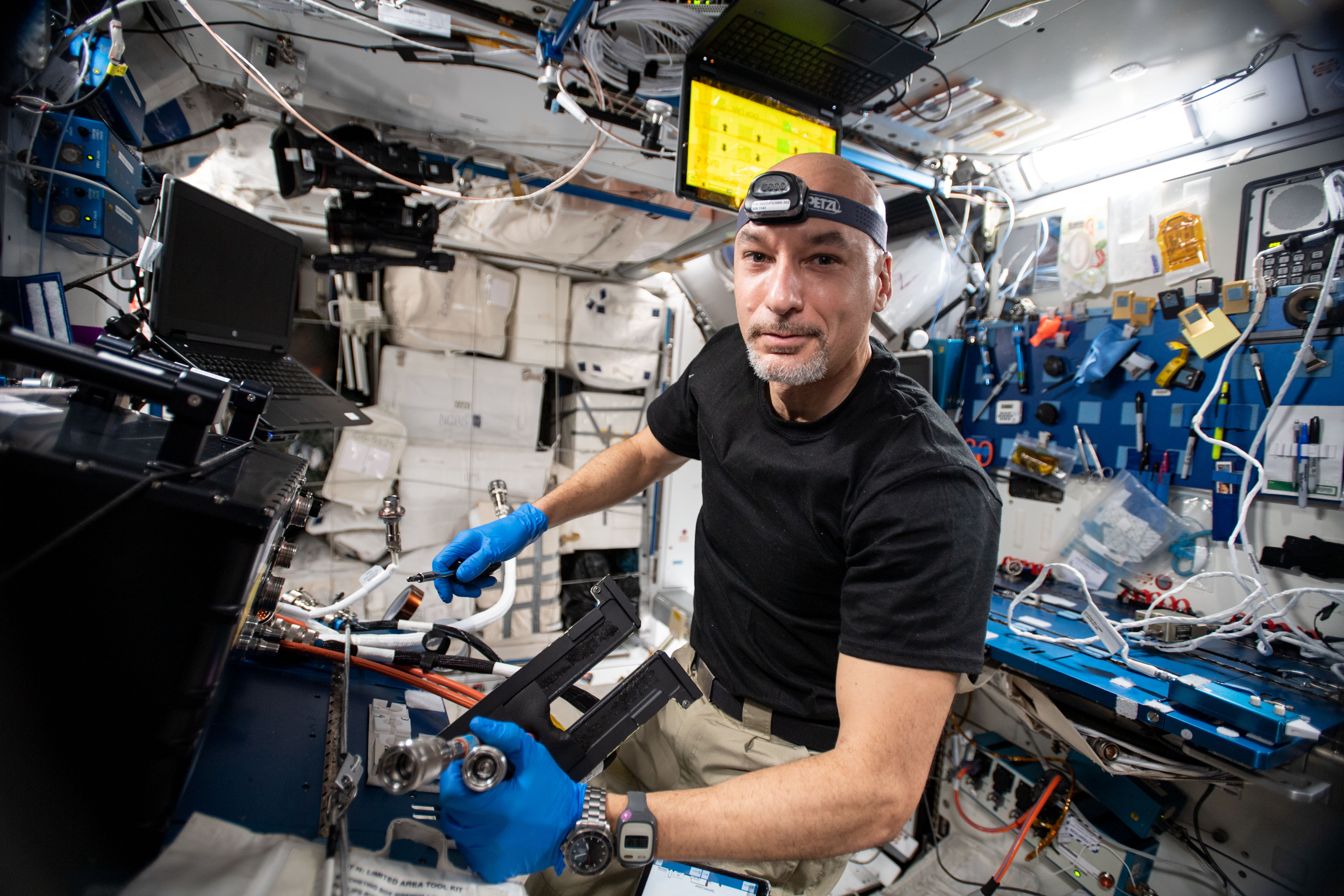 iss060e054549 -- Expedition 60 flight engineer Luca Parmitano of ESA (European Space Agency) works on swapping out a power cable located in the Fluid Science Laboratory, which is a facility designed by ESA for conducting fluid physics research in microgravity.