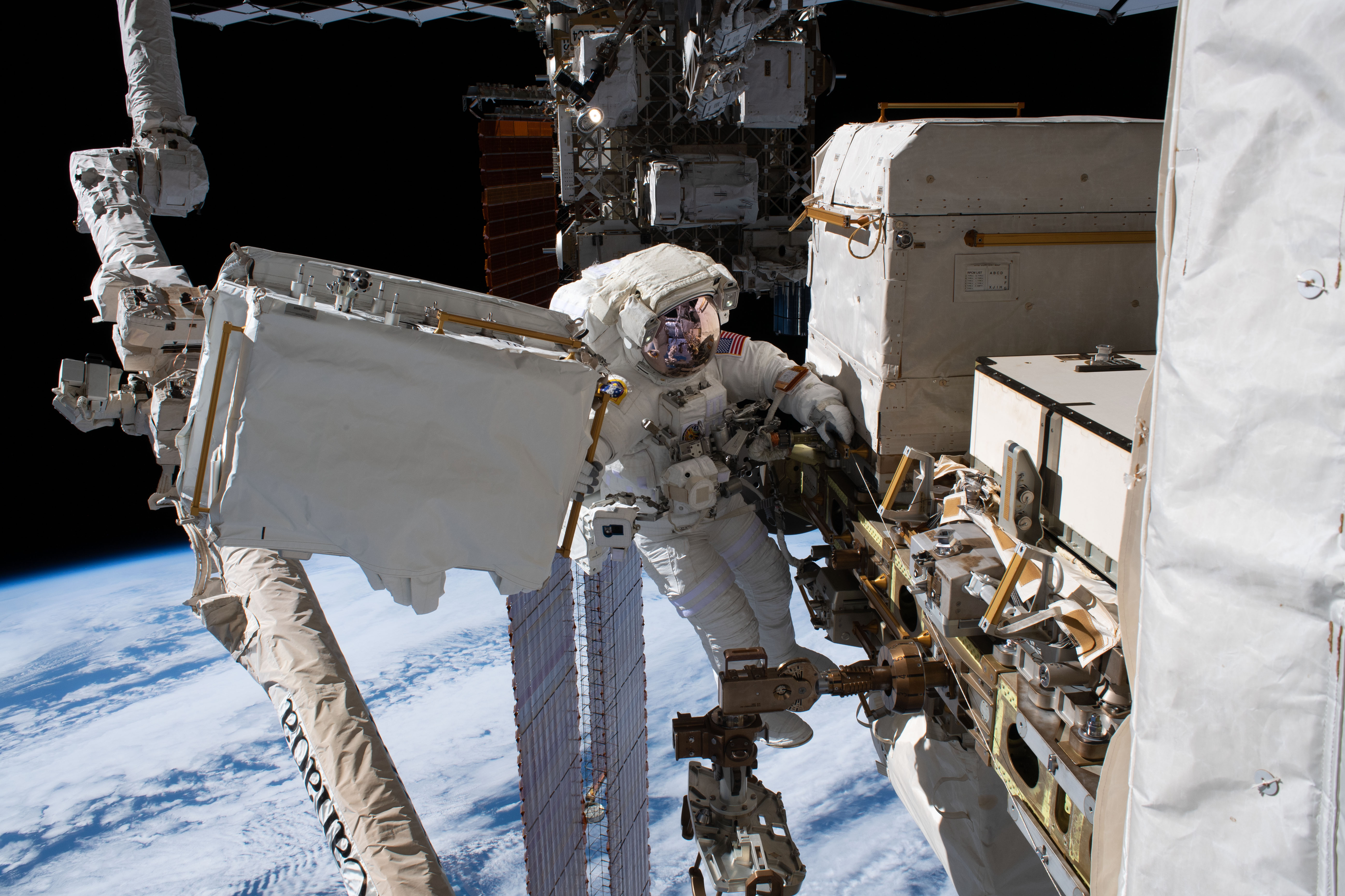 iss061e065379 (Dec. 2, 2019) --- NASA astronaut Andrew Morgan is tethered to the International Space Station with the Earth 250 miles below during the third spacewalk to upgrade the Alpha Magnetic Spectrometer's thermal pump system.