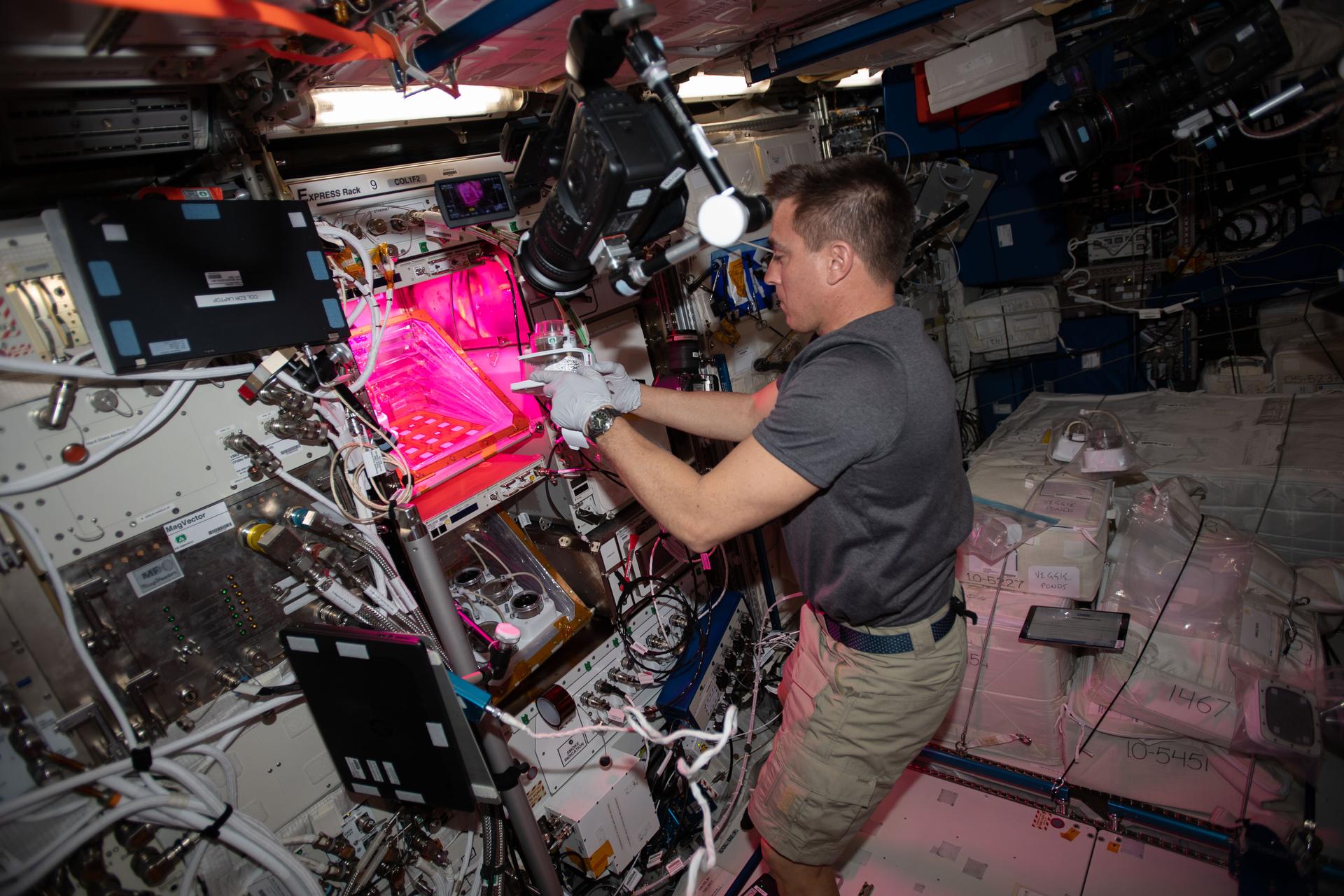 iss063e001873 (April 22, 2020) --- NASA astronaut and Expedition 63 Commander Chris Cassidy services botany research hardware inside the European Space Agency's Columbus laboratory module. The Veggie PONDS research facility in Columbus supports the growing and harvesting of lettuce and mizuna greens to demonstrate reliable vegetable growth during spaceflight.