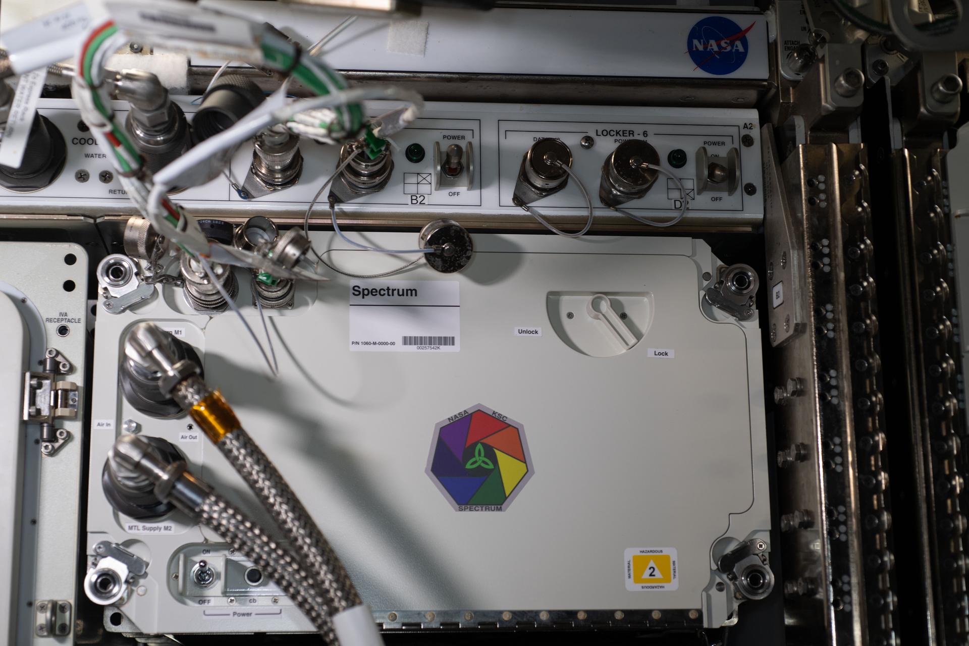 iss063e026090 (6/11/2020) --- A view during the Spectrum Facility installation into Expedite the Processing of Experiments to the Space Station (EXPRESS) Rack aboard the International space Station (ISS). Spectrum takes fluorescent images of biological specimens contained within a controlled environment. A high resolution, monochrome camera captures images of fluoresced proteins of plants within Petri plates.