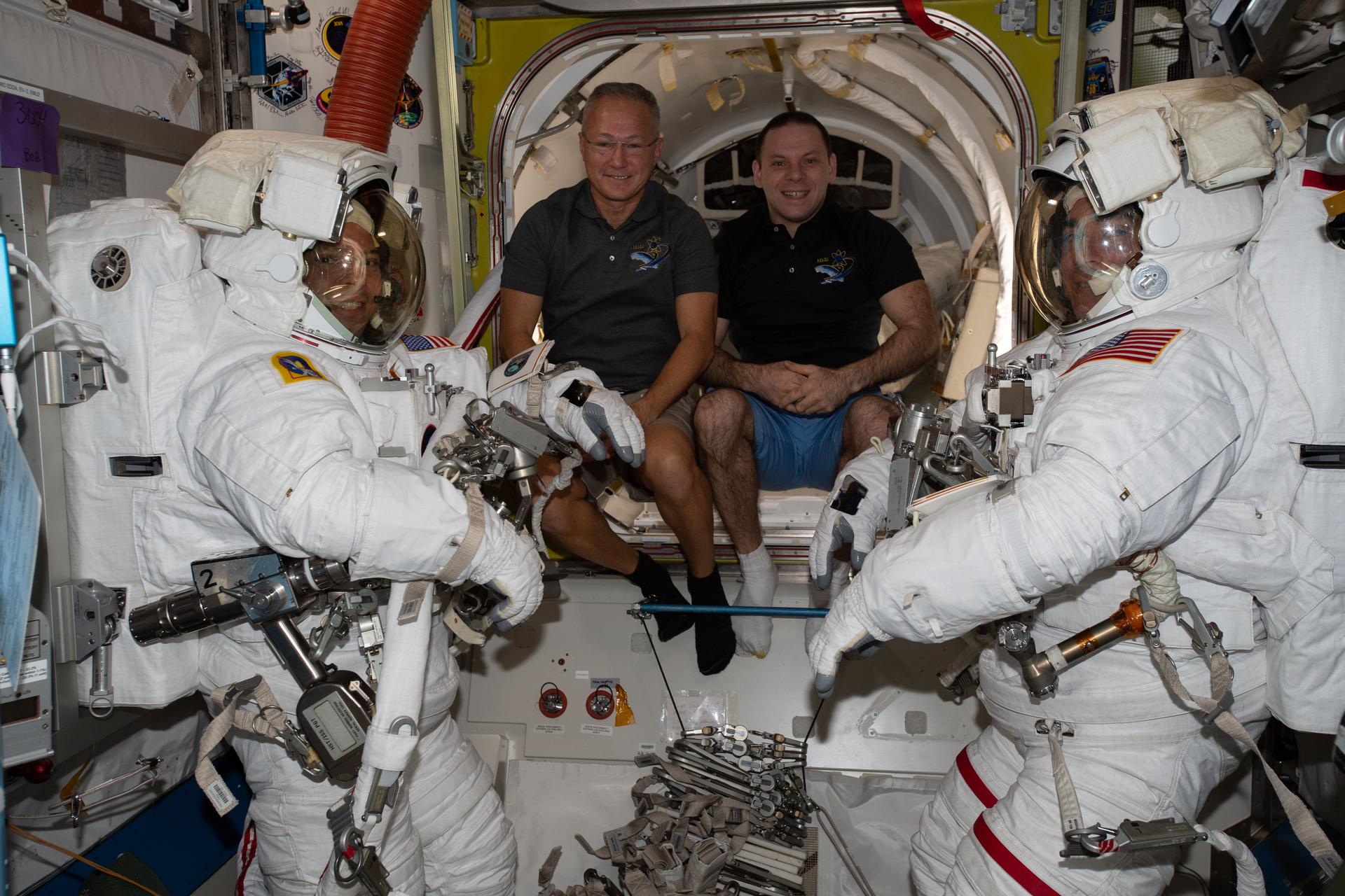 iss063e033532 (June 26, 2020) --- Spacewalkers Bob Behnken (far left) and Chris Cassidy (far right) are suited up with assistance from Expedition 63 Flight Engineers (middle left) Doug Hurley and Ivan Vagner (middle right) ahead of their June 26 spacewalk.