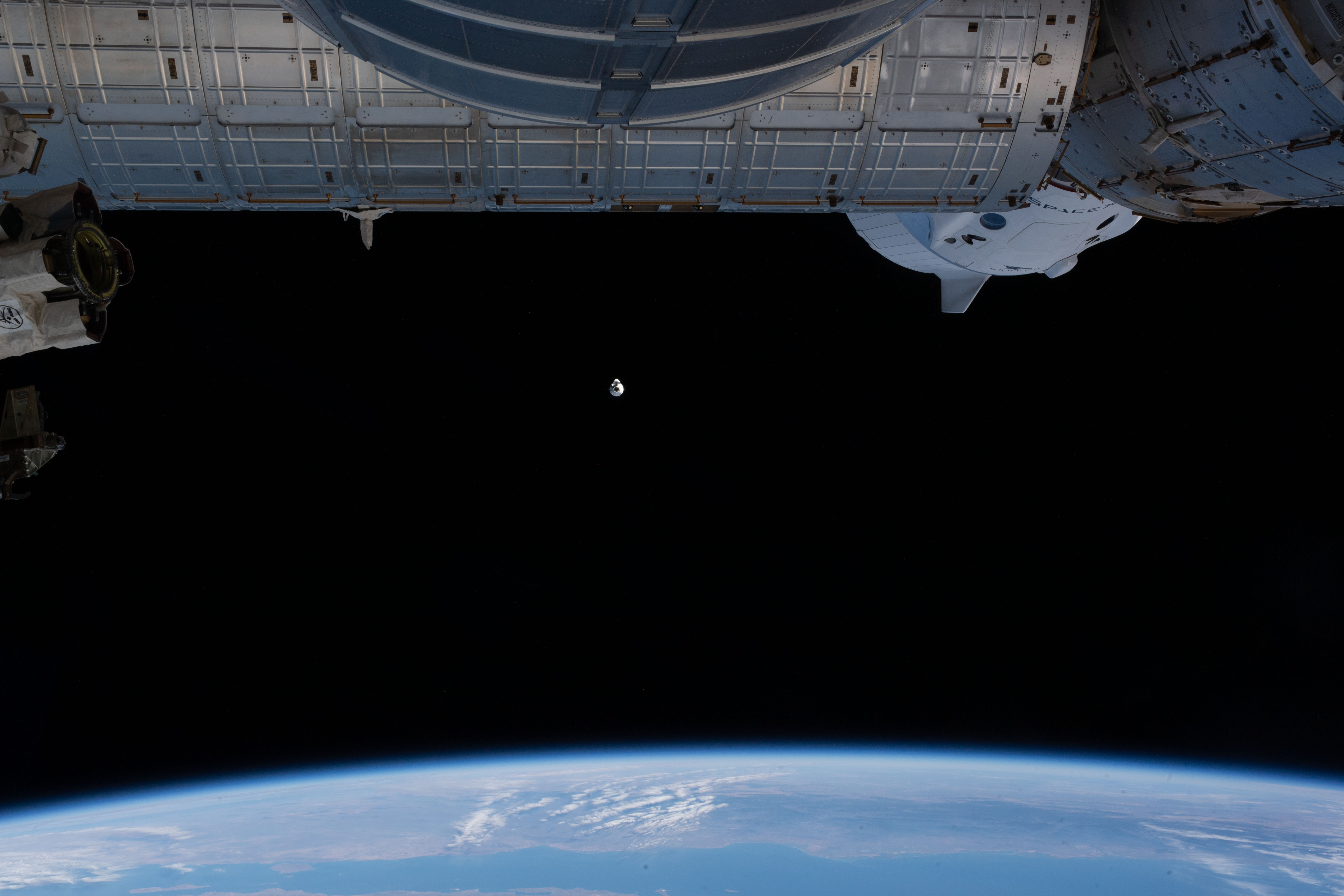 iss064e010904 (Dec. 7, 2020) --- The upgraded SpaceX Cargo Dragon vehicle approaches the International Space Station as both vehicles were orbiting above the Pacific Ocean off the coast of Mexico. Near the top right of the photograph is a portion of the SpaceX Crew Dragon vehicle docked to the forward port of the Harmony module. The Cargo Dragon would dock about an hour later to Harmony's space-facing port marking the first time two Dragon spaceships would be docked to the station at the same time.