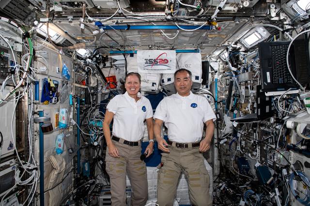 iss064e016868 (Dec. 30, 2020) --- NASA astronaut Shannon Walker and JAXA astronaut Soichi Noguchi take a moment to pose for a portrait together inside the Japanese Kibo laboratory module.