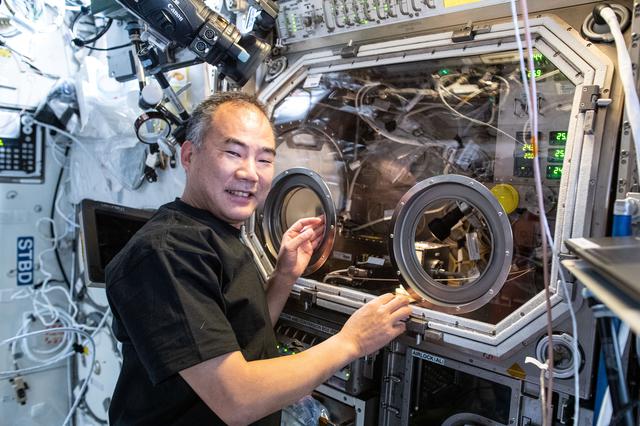 Semiconductor crystals are an essential component in all computer chips, sensors, and wireless communication devices. Noguchi conducts the SUBSA investigation inside the microgravity glovebox to test a new method for producing semiconductor crystals. Findings from this work may improve the quality of the chips used inside consumer devices on Earth.