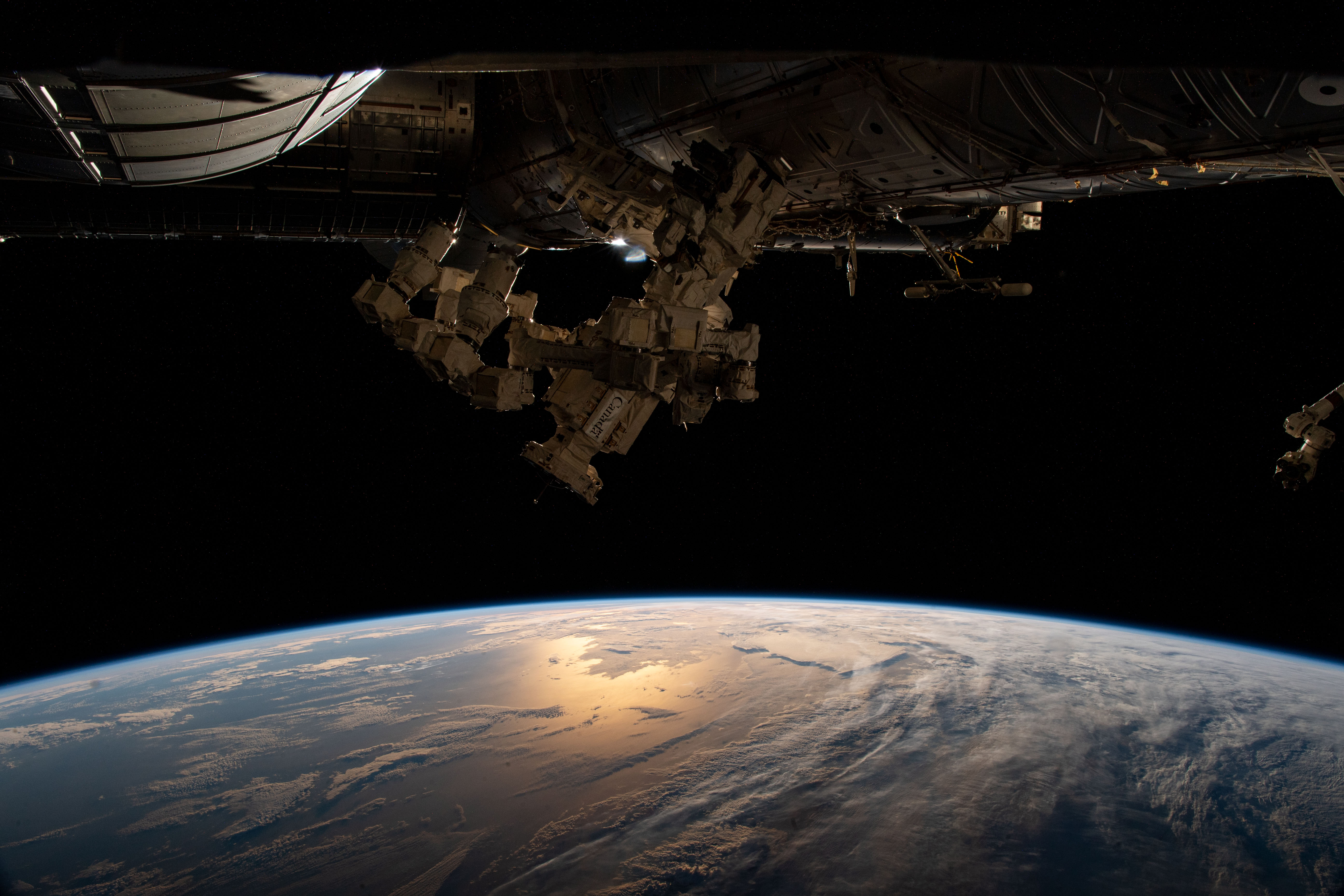 iss064e053054 (April 5, 2021) --- The sun's glint beams off the Atlantic Ocean as the International Space Station soared 271 miles above the southern coast of Argentina. In the foreground, is "Dextre," or Special Purpose Dexterous Manipulator, the robotic hand from the Canadian Space Agency for fine-tuned robotic maintenance activities outside of the orbiting lab.