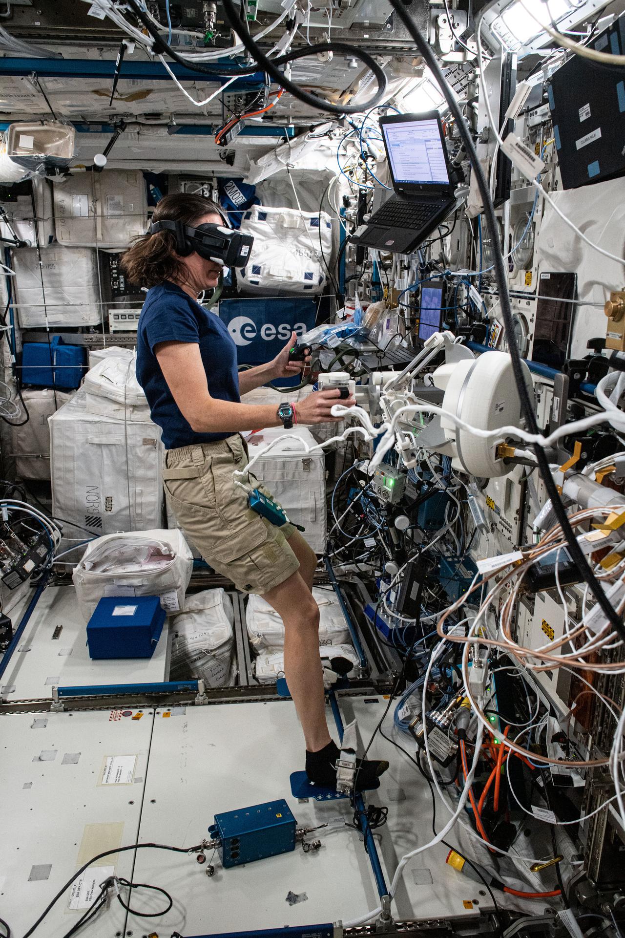 ss065e073986 (May 26, 2021) --- NASA astronaut Megan McArthur participate in the Pilote experiment. The experiment from the European Space Agency uses virtual reality gear and tests a crew member’s aptitude when maneuvering a computer-generated robotic arm toward a target. Results may influence the design of workstations and interfaces for future spacecraft and space habitats.