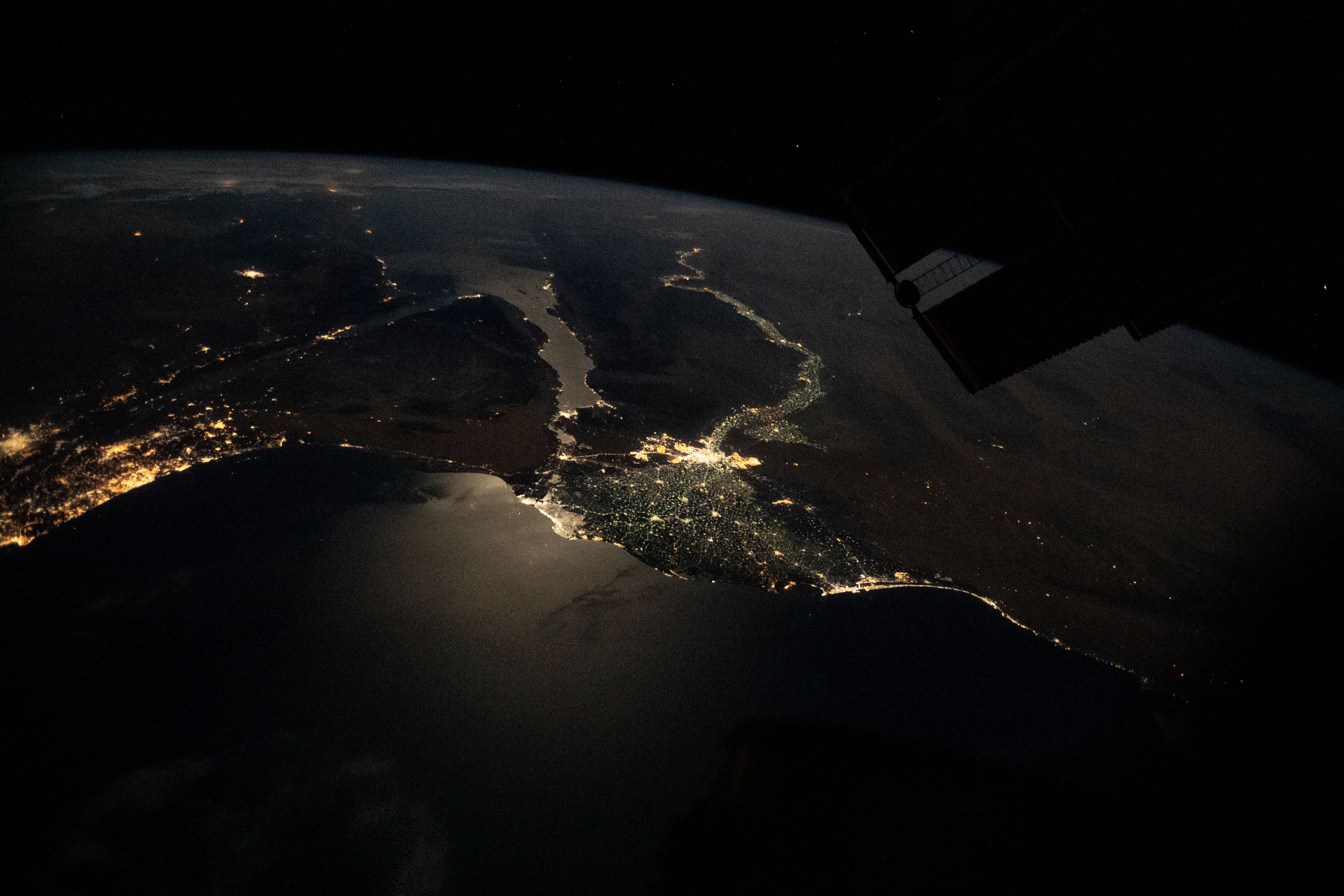 iss065e074560 (May 20, 2021) --- This nighttime photograph, taken from the International Space Station as it orbited 263 miles above Turkey, highlights the Moon's glint on the Mediterranean Sea and the Gulf of Suez. The city lights along the Nile Delta and the eastern Mediterranean coast also figure prominently in the picture.