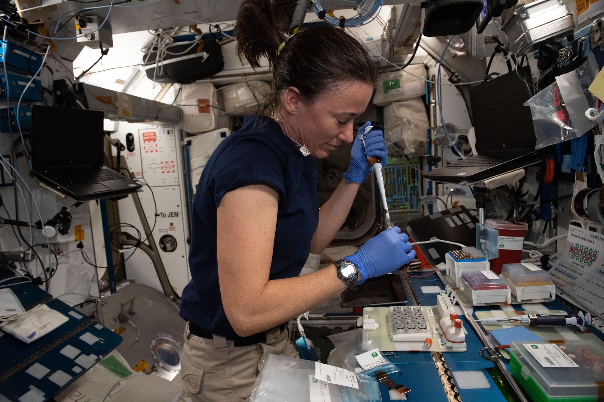 iss065e085491 (June 3, 2021) --- NASA astronaut and Expedition 65 Flight Engineer Megan McArthur loads protein crystallography plates with protein solutions for the Real-time Protein Crystal Growth experiment. The biotechnology study demonstrates new methods for producing high-quality protein crystals in microgravity. Results may help identify new targets and develop better drugs to treat a variety of diseases on Earth and advance the commercialization of low-Earth orbit.