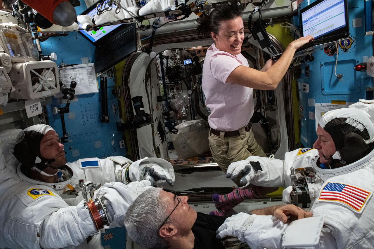 iss065e095839 (June 10, 2021) --- Expedition 65 Flight Engineers Megan McArthur and Mark Vande Hei support astronauts Thomas Pesquet (left) and Shane Kimbrough (right) as they test their U.S. spacesuits for a fit verification. Pesquet and Kimbrough are preparing for two spacewalks on June 16 and 20 to install a pair of new solar arrays augmenting the International Space Station's power system.