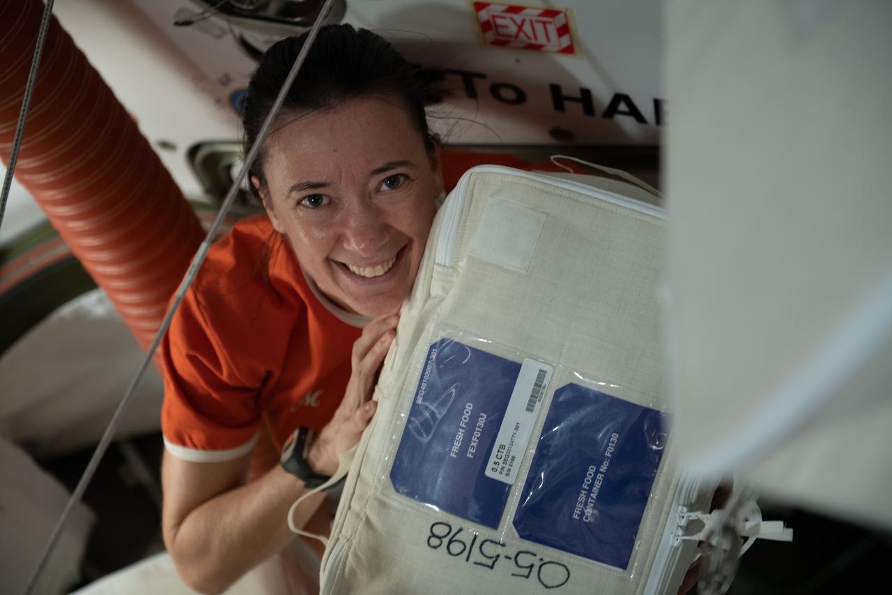 iss065e242226 (Aug. 13, 2021) --- NASA astronaut and Expedition 65 Flight Engineer Megan McArthur unpacks a fresh food container from the newly-arrived Northrop Grumman Cygnus space freighter.
