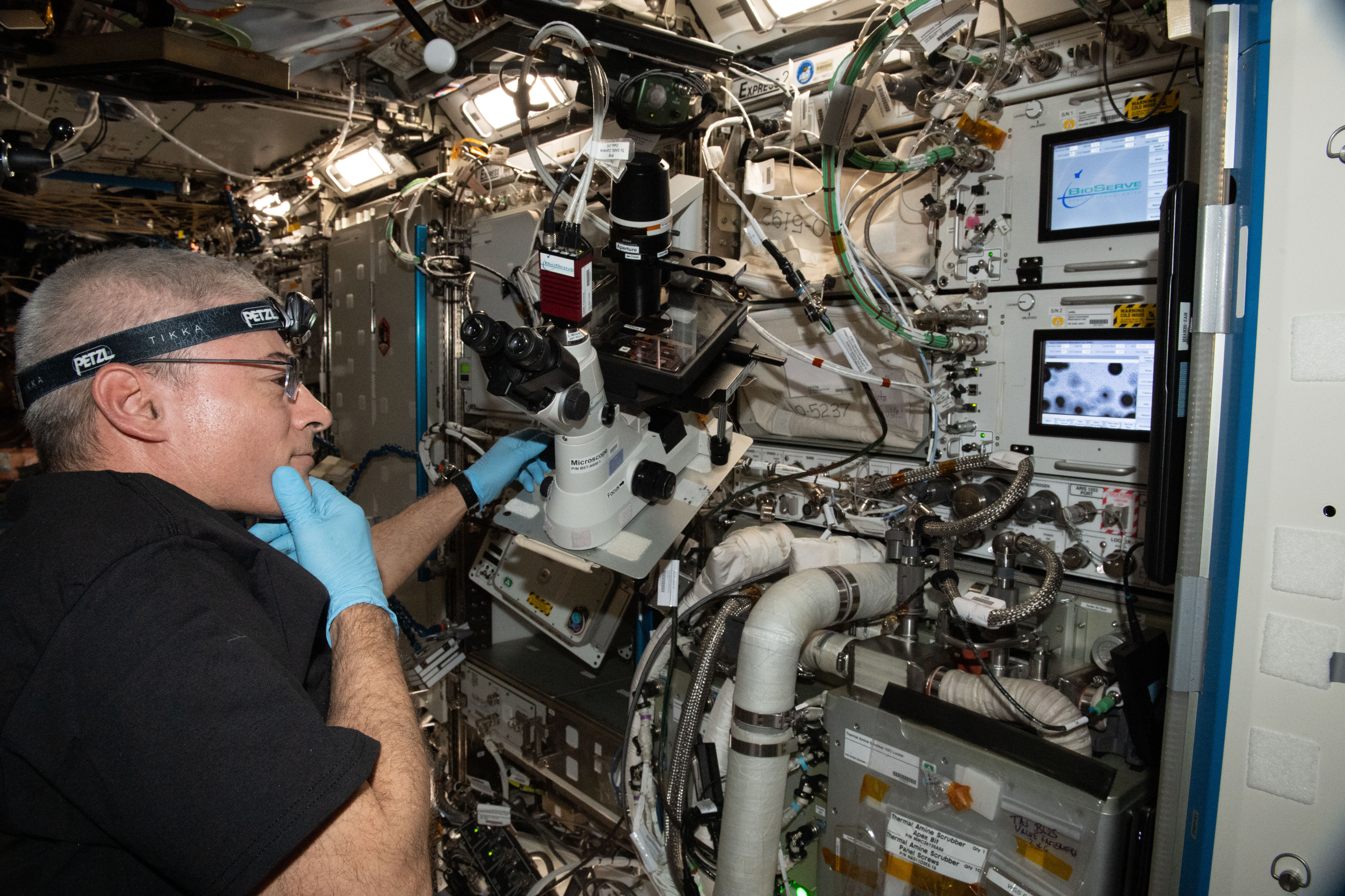 iss065e242415 (Aug. 15, 2021) --- NASA astronaut and Expedition 65 Flight Engineer Mark Vande Hei performs microscopy operations to capture images of the Cardinal Muscle investigation BioCells wells aboard the International Space Station. This study tests whether such engineered tissues cultured in space could provide a model for studying muscle loss and assessing possible therapeutics prior to clinical trials.