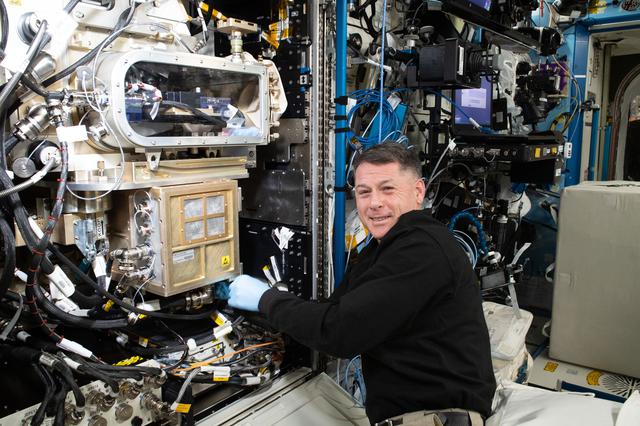 iss065e257486 (Aug. 17, 2021) --- NASA astronaut and Expedition 65 Flight Engineer Shane Kimbrough installs and configures a new Advanced Colloids Experiment module inside the U.S. Destiny laboratory module's Fluids Integrated Rack (FIR). The work supports the ACE-T9 fluid physics study that uses the FIR's Light Microscopy Module to image colloidal molecules for insights into the development of advanced materials not possible to produce in Earth's gravity.