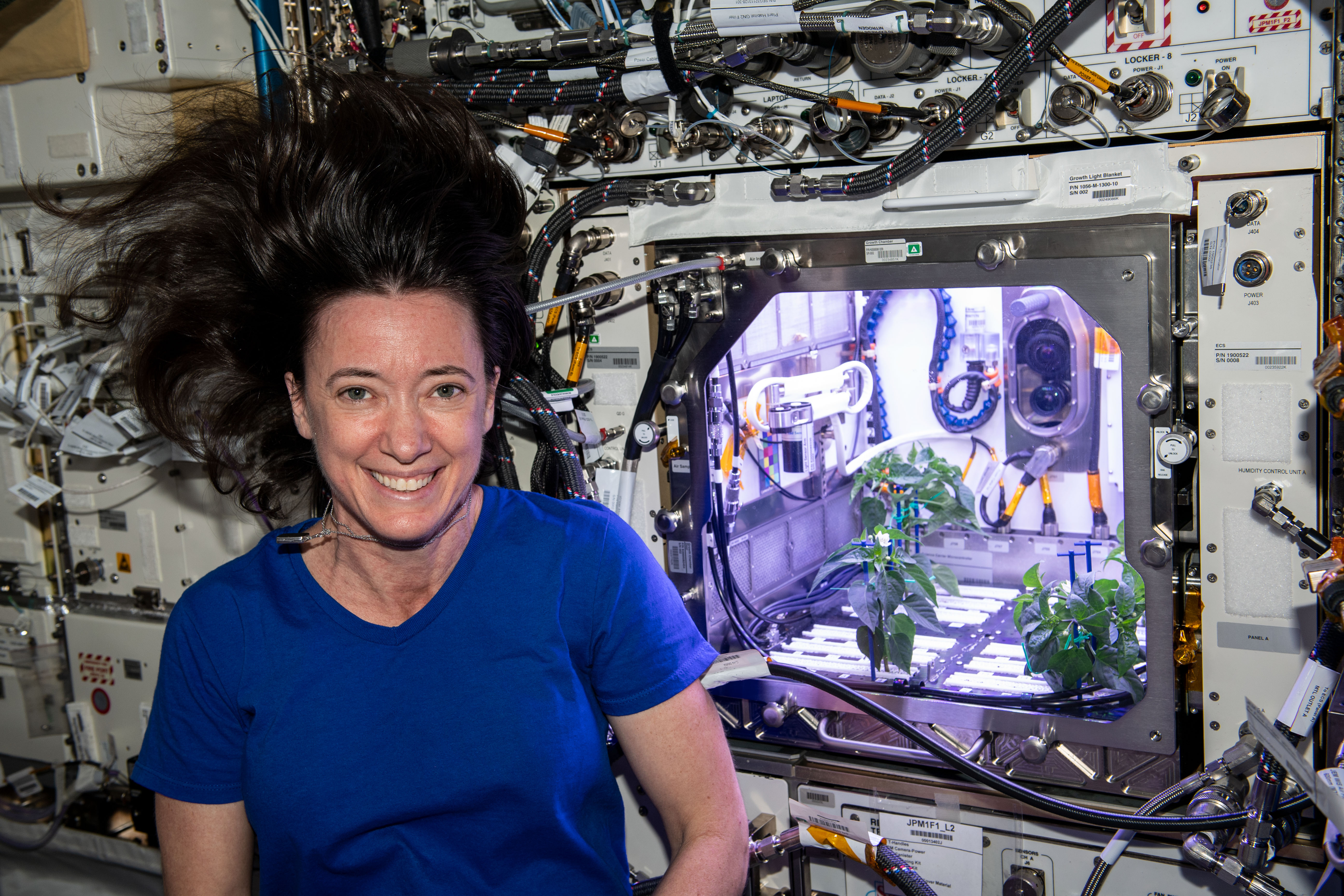 iss065e346115 (September 2, 2021) -- NASA astronaut and Expedition 65 Flight Engineer Megan McArthur poses with the crop of chile peppers being grown as part of the Plant Habitat-04 investigation inside the Advanced Plant Habitat (APH) aboard the International Space Station. This is the first time chile peppers are being grown aboard the orbiting laboratory, and are one of the most complex plant experiments on the station to date because of the long germination and growing times. The pepper seeds were activated on July 12. 2021 and will grow for about four months, during which time they will be harvested twice. Astronauts will sample some of the peppers and return the rest to Earth for scientific analysis.