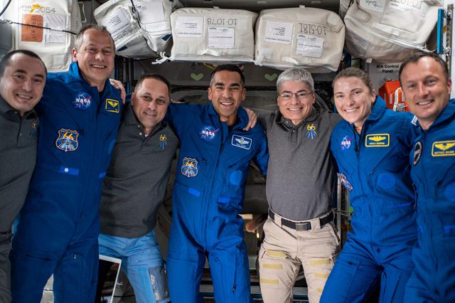 iss066e077280 (Nov. 12, 2021) --- The seven-member Expedition 66 crew poses for a portrait shortly after the SpaceX Crew-3 astronauts docked to the International Space Station inside the SpaceX Crew Dragon Endurance. From left are, Pyotr Dubrov of Roscosmos; Thomas Marshburn of NASA; Anton Shkaplerov of Roscosmos; Raja Chari, Mark Vande Hei and Kayla Barron, all from NASA; and Matthias Maurer from ESA (European Space Agency).