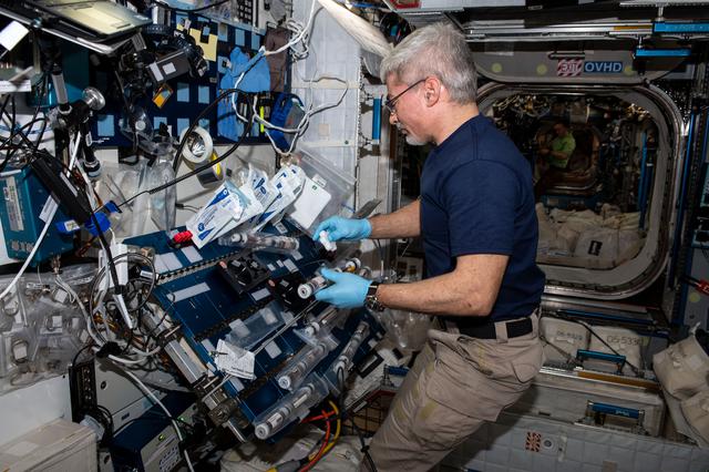 iss066e108292 (Jan. 6, 2022) --- NASA astronaut and Expedition 66 Flight Engineer Mark Vande Hei conducts operations for the Plant Habitat-5 space agriculture experiment that is studying cotton genetics.