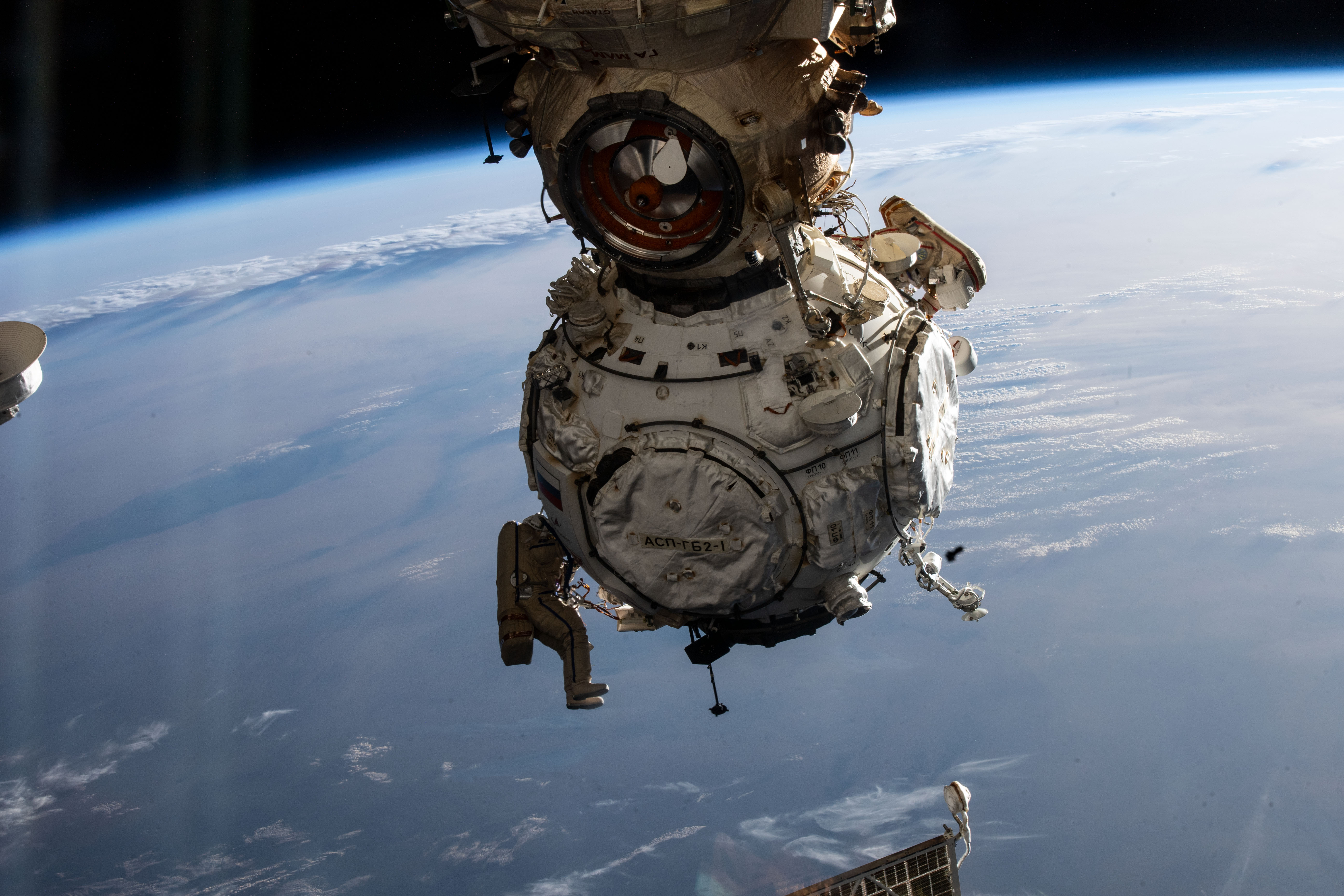 iss066e122050 (Jan. 19, 2022) --- Cosmonauts Pyotr Dubrov (attached to the bottom left portion of the Prichal docking module) and Anton Shkaplerov (attached to the top right of Prichal) work to configure and activate Russia's newest module with the Russian segment of the International Space Station during a seven-hour and 11-minute spacewalk.