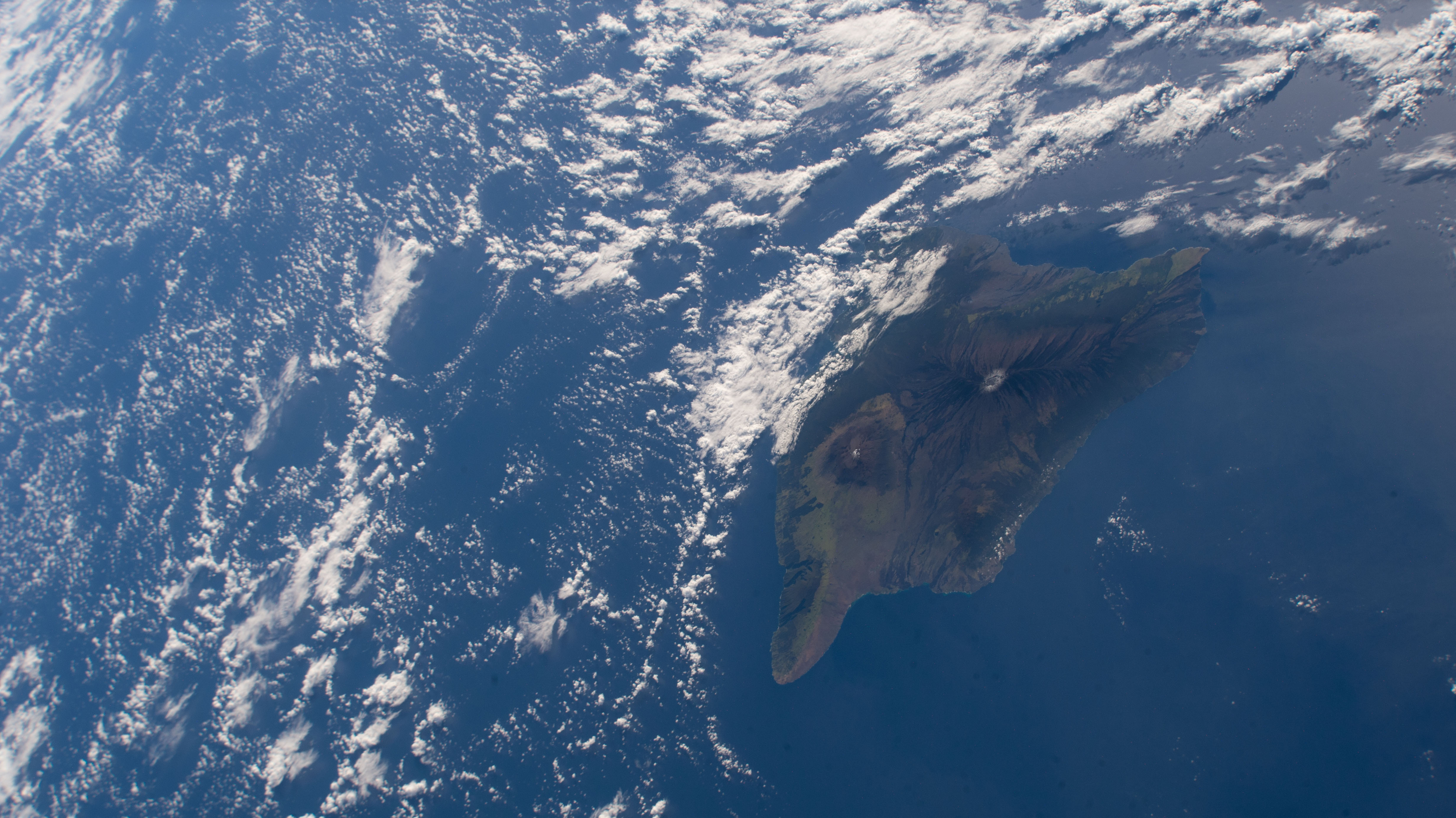 iss066e137869 (Feb. 8, 2022) --- Hawaii's big island and its two major volcanoes Mauna Kea and Mauna Loa are pictured from the International Space Station as it orbited 258 miles above the Pacific Ocean south of the Hawaiian island chain