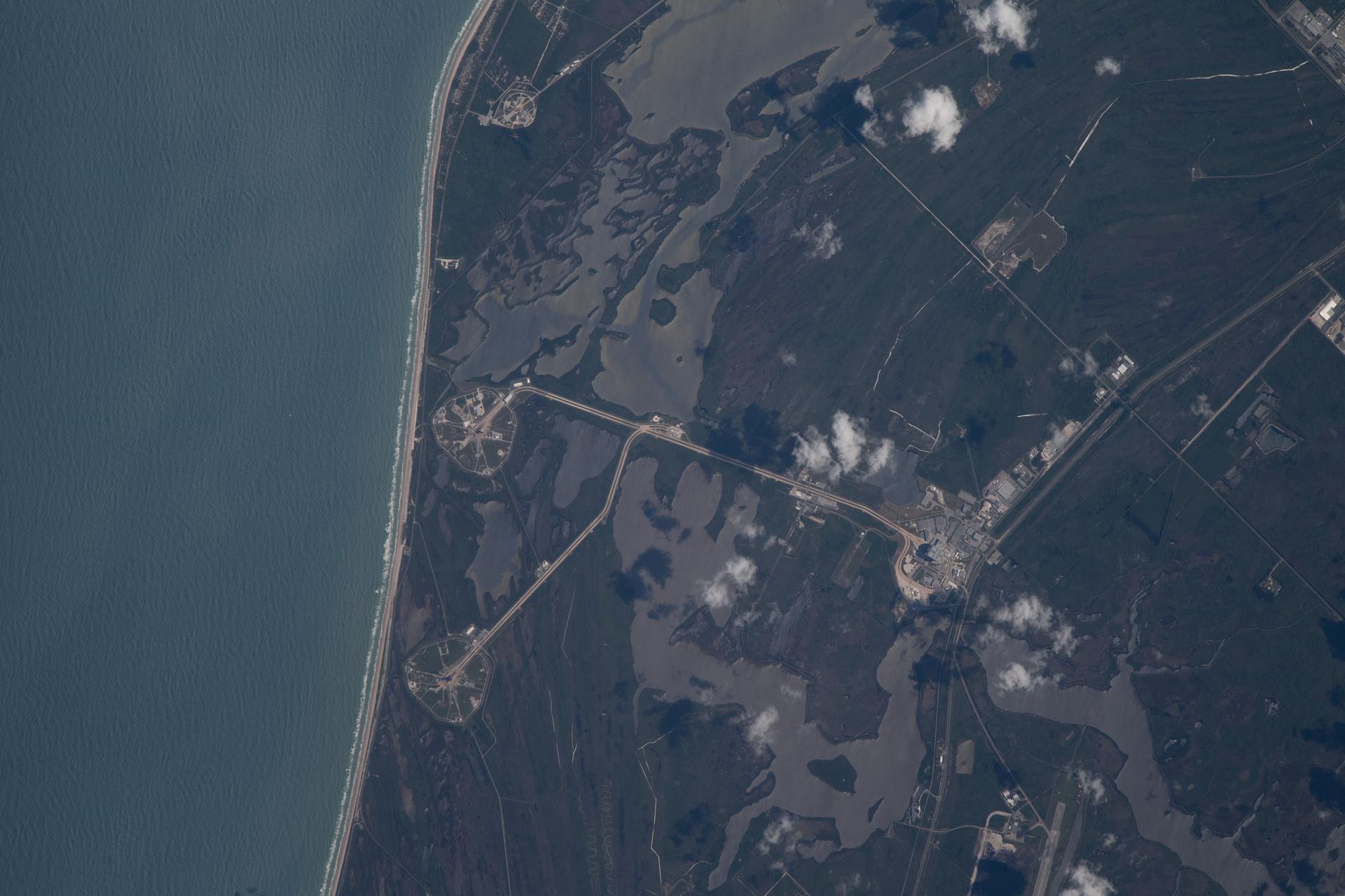 iss067e000331 (March 30, 2022) --- The International Space Station was orbiting just off the coast of Cape Canaveral, Florida, about 260 miles above the Atlantic Ocean when Expedition 67 Flight Engineer Raja Chari photographed NASA's Kennedy Space Center. The agency's two launch pads, 39A (at top) and 39B (at bottom), are clearly seen on the beach. Standing at launch pad 39B is NASA's Space Launch System (SLS) rocket with the Orion spacecraft atop. The rocket is being prepared for the uncrewed Artemis I mission "that will demonstrate NASA’s commitment and capacity to extend humanity’s presence on the Moon – and beyond."