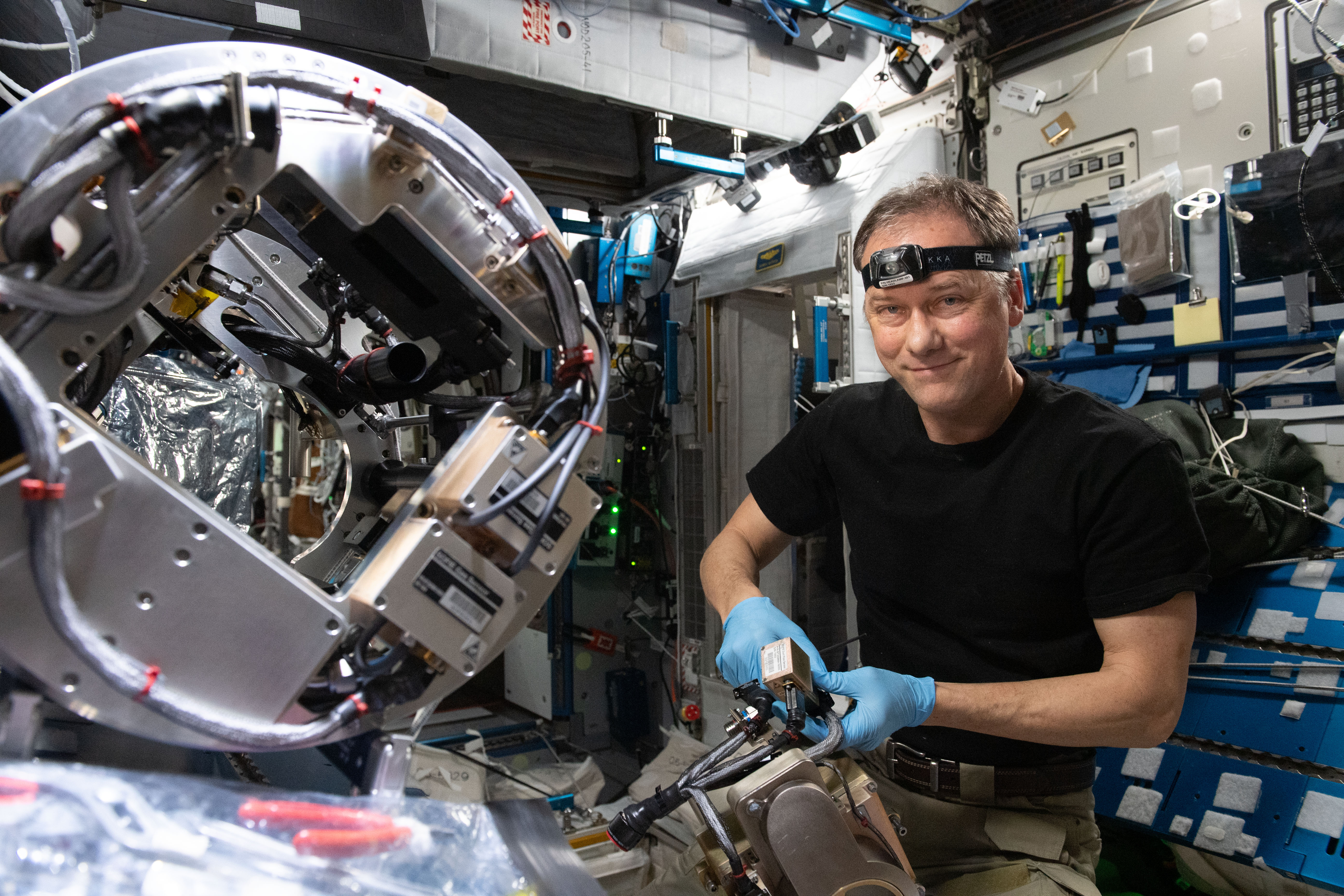 iss067e003895 (April 6, 2022) --- NASA astronaut and Expedition 67 Commander Thomas Marshburn configures the Combustion Integrated Rack's combustion chamber for the Solid Fuel Ignition and Extinction study to investigate material flammability and ways to improve fire safety in space.
