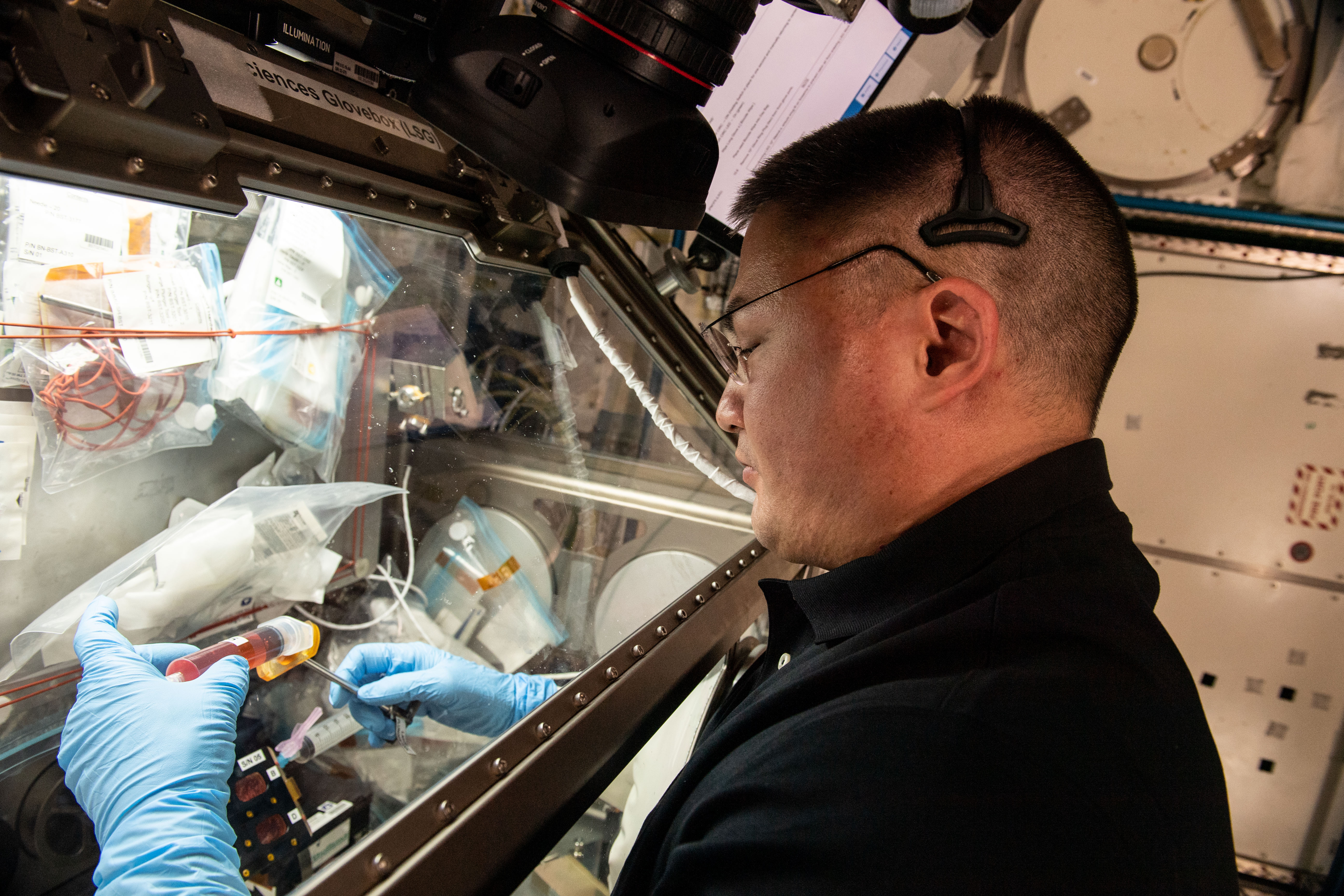 iss067e203859 (July 26, 2022) --- Expedition 67 Flight Engineer and NASA astronaut Kjell Lindgren processes samples inside the Life Science Glovebox for the Immunosenescence space biology study. The experiment takes place inside the International Space Station's Kibo laboratory module and explores the immunological aging of cells in weightlessness possibly informing therapies for immune system conditions humans may experience living on and off Earth.