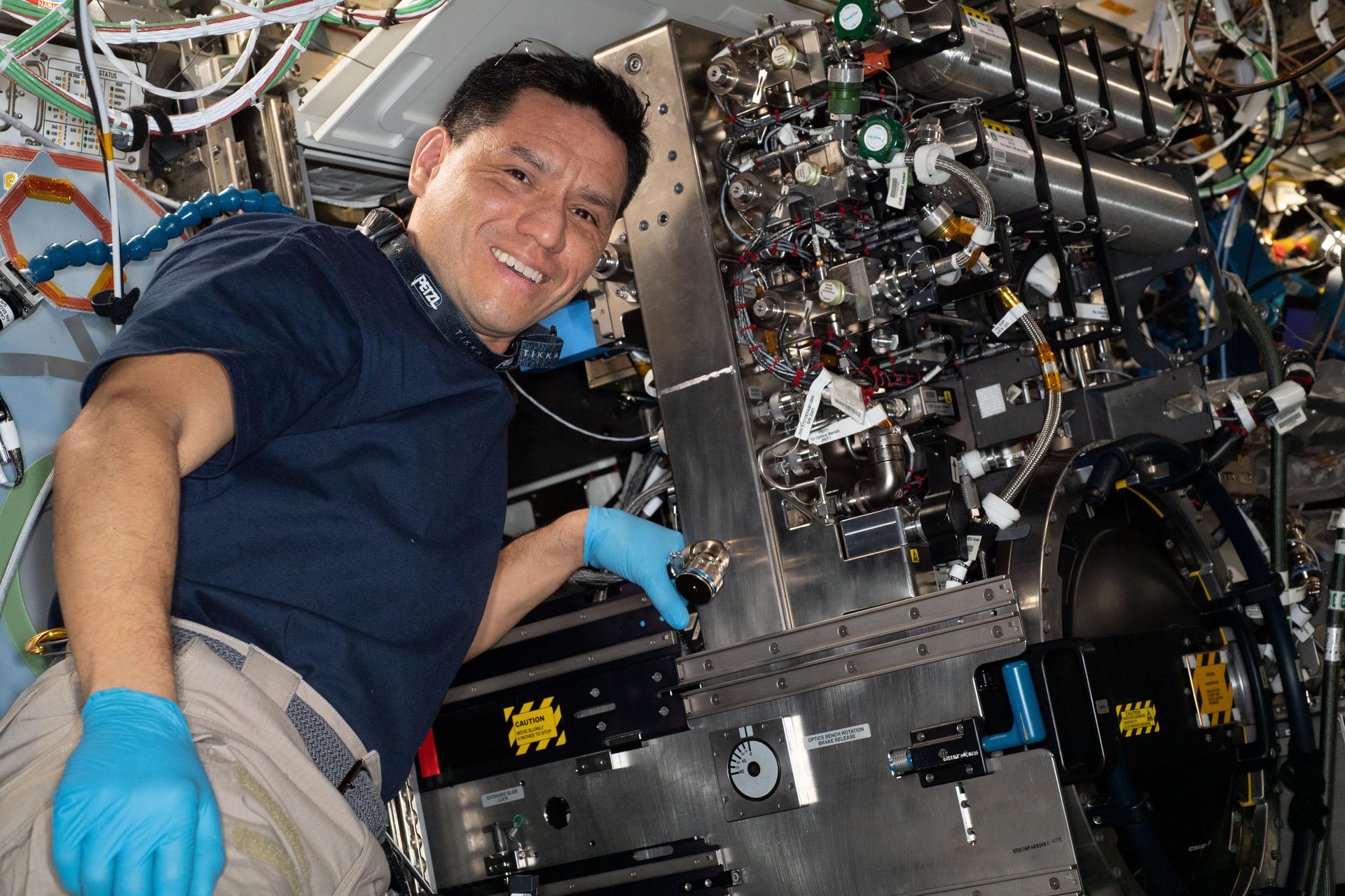 iss068e027723 (Dec. 7, 2022) --- NASA astronaut and Expedition 68 Flight Engineer Frank Rubio replaces components inside the Combustion Integrated Rack, a research facility that enables safe observations of flame, fuel, and soot phenomena in microgravity.