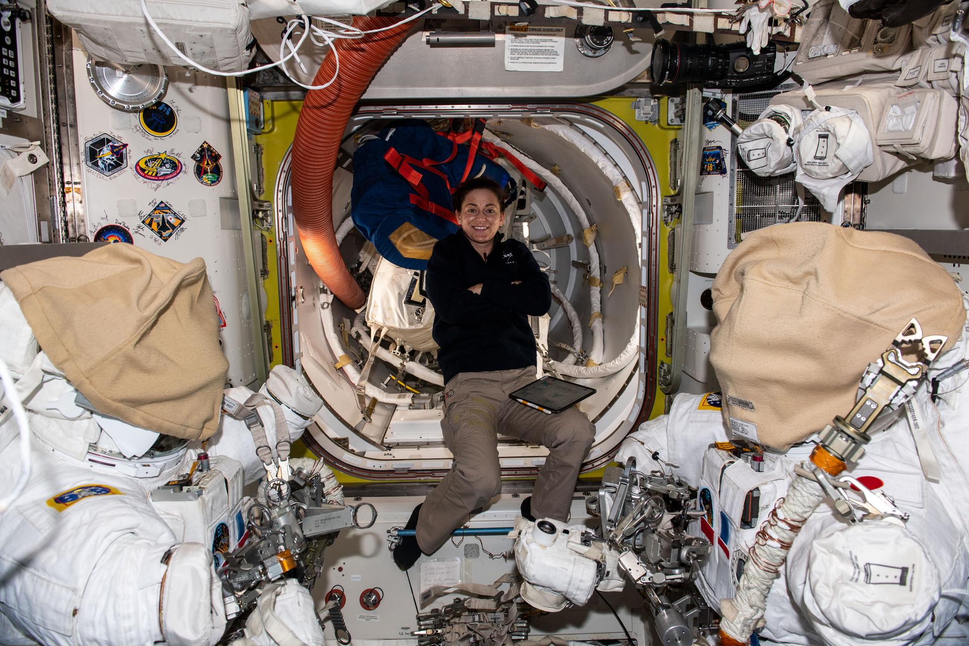 iss068e044025 (Jan. 31, 2023) --- NASA astronaut and Expedition 68 Flight Engineer Nicole Mann is pictured inside the International Space Station's Quest airlock while organizing spacewalk tools and hardware. In the foreground, are two Extravehicular Mobility Units (EMUs), or spacesuits, with their helmets covered and the lower arms and gloves detached.