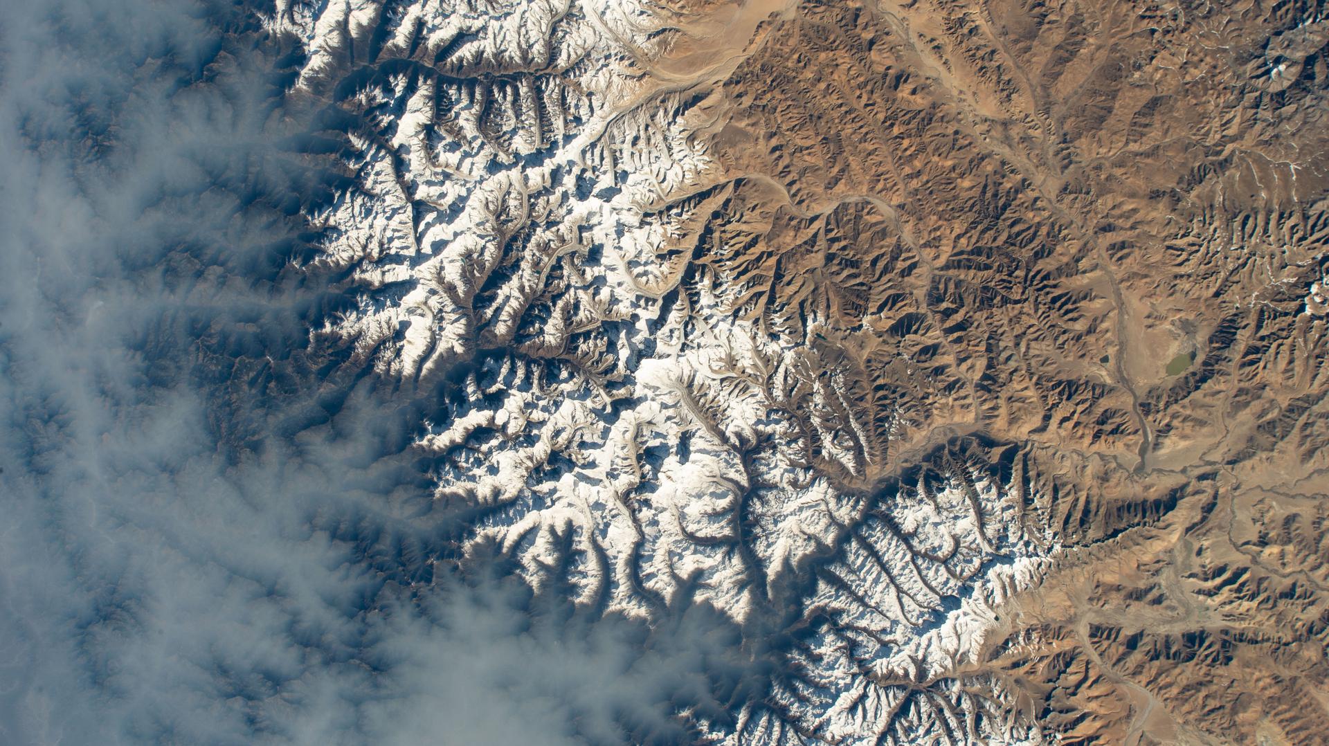 iss069e003192 (April 13, 2023) --- Clouds gather on Nepal's sub-tropical side of the Himalayas with Mount Everest at the center of this photograph taken by an external high definition camera on the International Space Station as it orbited 263 miles above the Indian subcontinent.
