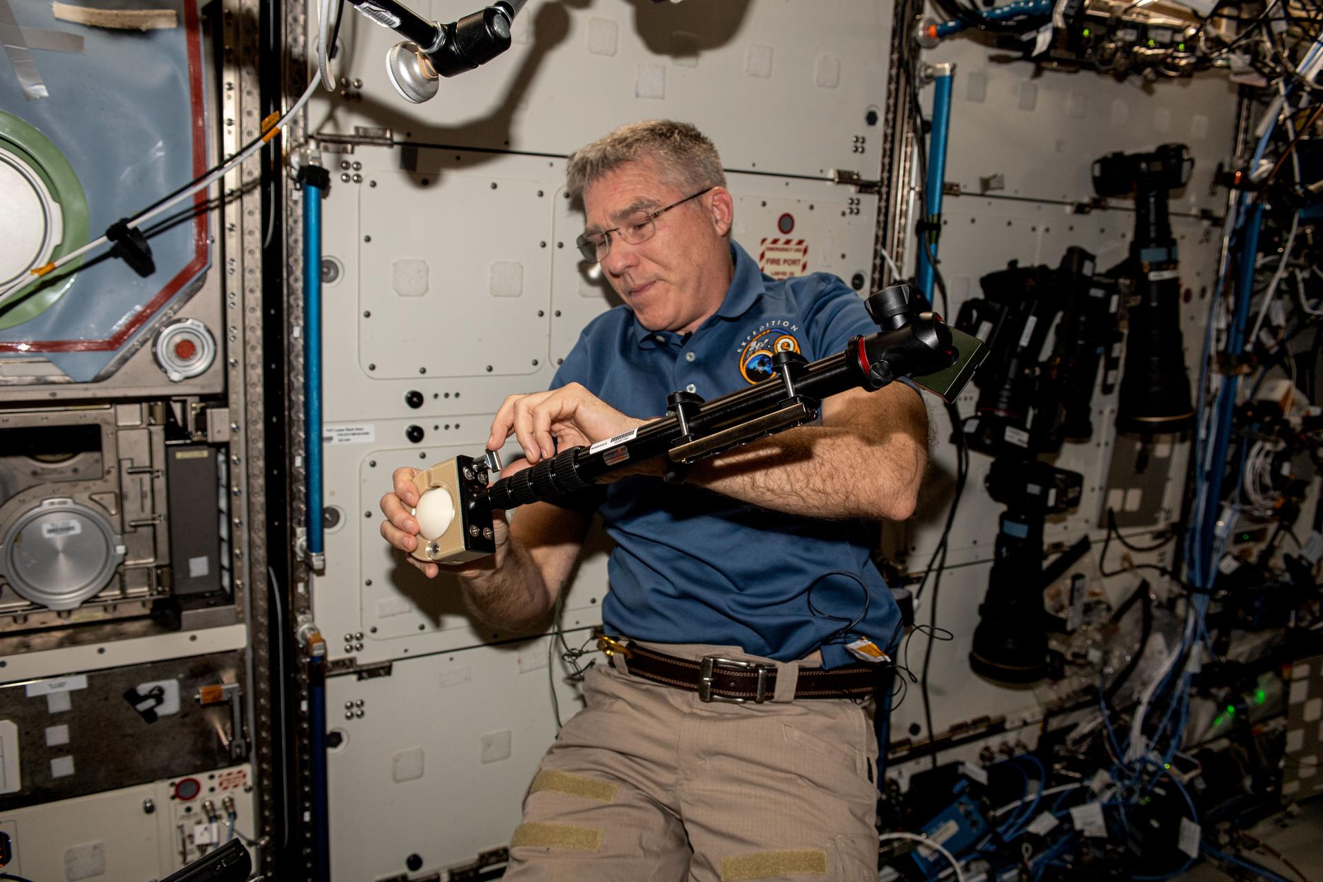 iss069e009796 (May 9, 2023) --- NASA astronaut and Expedition 69 Flight Engineer Stephen Bowen installs student-made hardware next to the Destiny laboratory module's Microgravity Science Glovebox. The High school students United with NASA to Create Hardware (HUNCH) Ball Clamp Monopod (HUNCH Ball Clamp Monopod) investigation tests a platform for holding cameras used to track targets on the ground or take images and video within space station modules