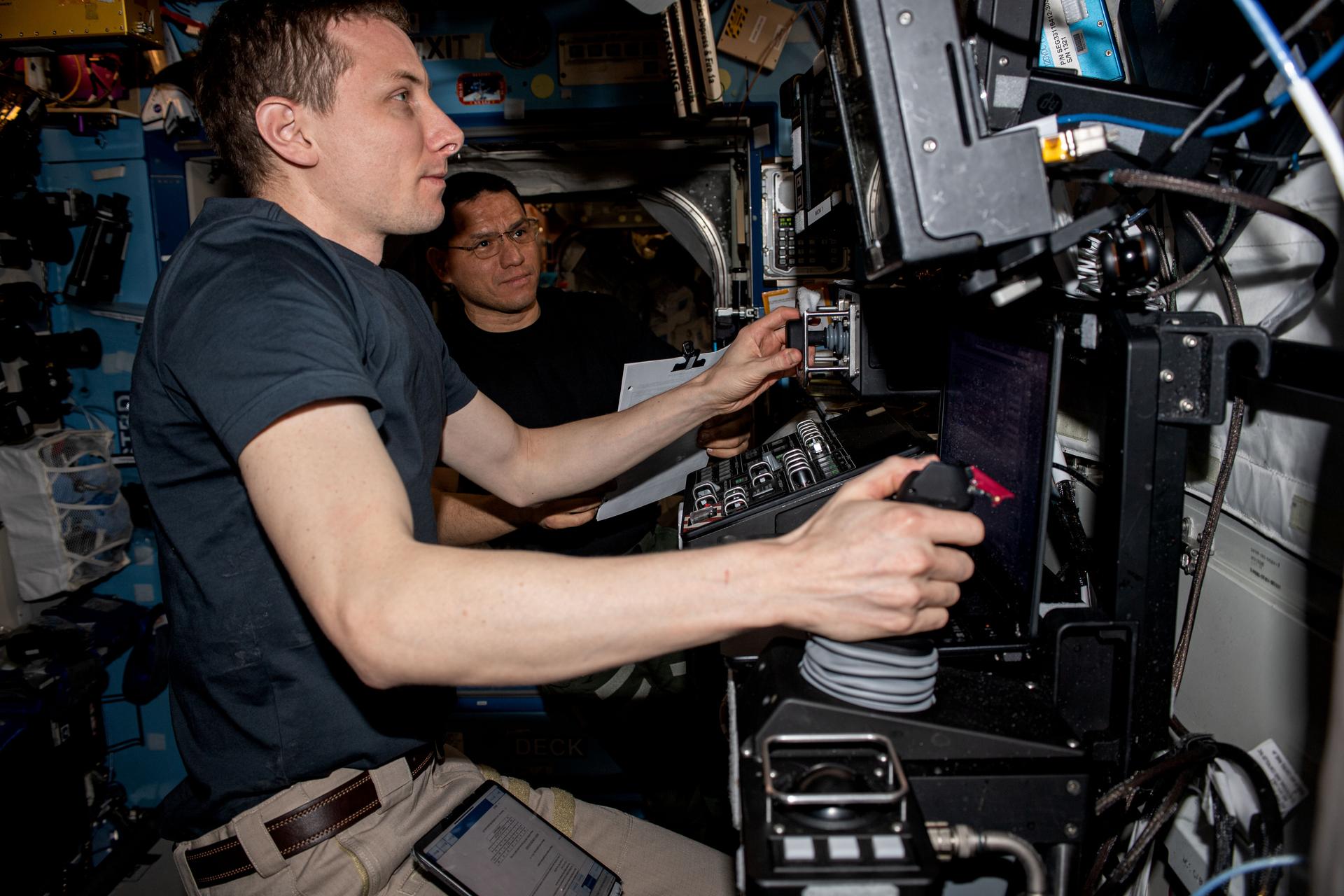 iss069e051734 (July 31, 2023) --- Expedition 69 Flight Engineers (from left) Woody Hoburg and Frank Rubio, both from NASA, are pictured practicing on the International Space Station's robotics workstation to capture Northrop Grumman's Cygnus cargo craft with the Canadarm2 robotic arm.