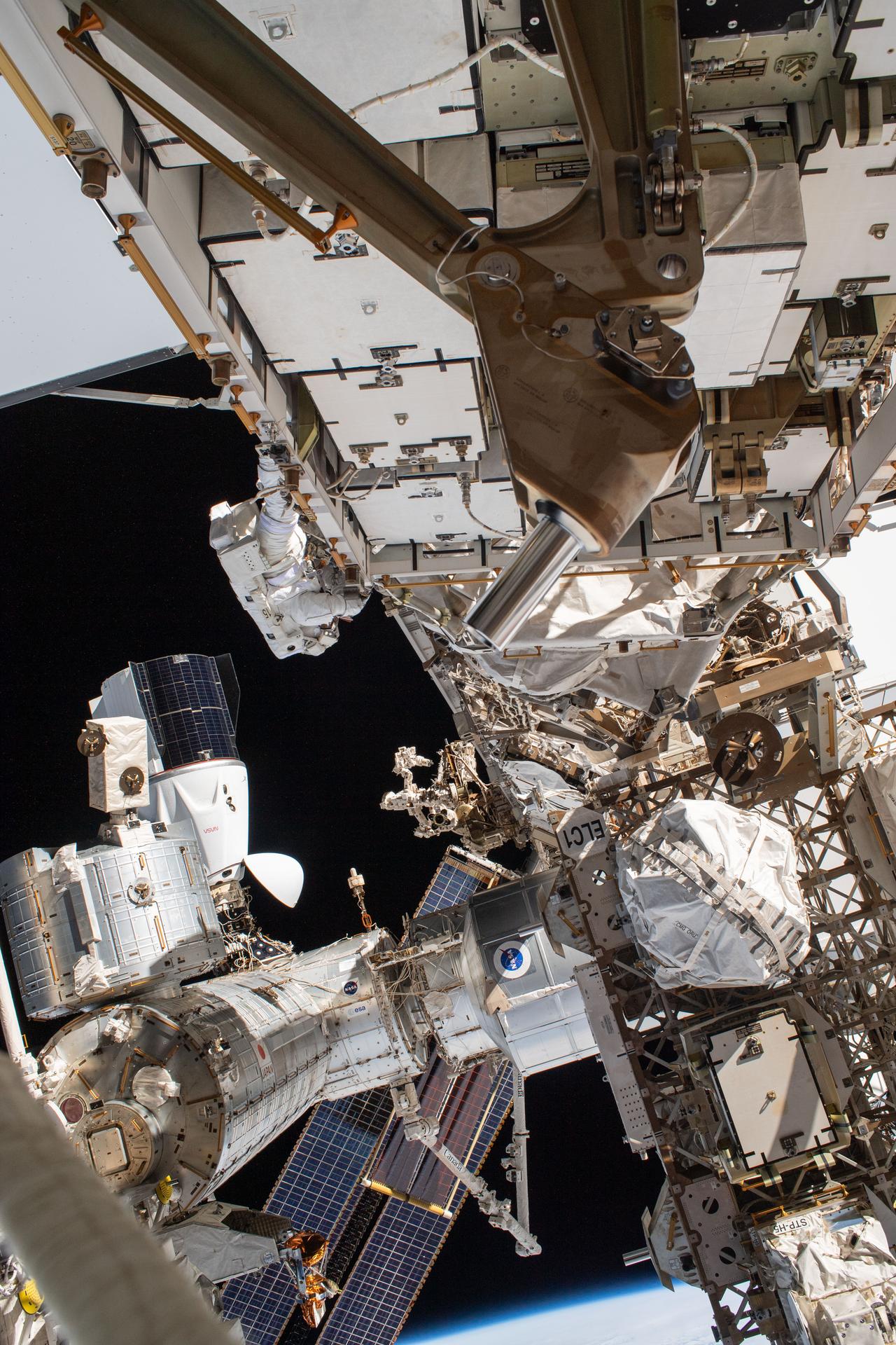 iss070e015526 (Nov. 1, 2023) --- NASA astronaut and Expedition 70 Flight Engineer Loral O'Hara is pictured (center left) tethered to the International Space Station's port truss structure during a spacewalk to replace one of the 12 trundle bearing assemblies on the port solar alpha rotary joint, which allows the arrays to track the Sun and generate electricity to power the station. Behind O'Hara is the SpaceX Dragon Endurance spacecraft that delivered four SpaceX Crew-7 crew members to the orbital lab on Aug. 23, 2023.