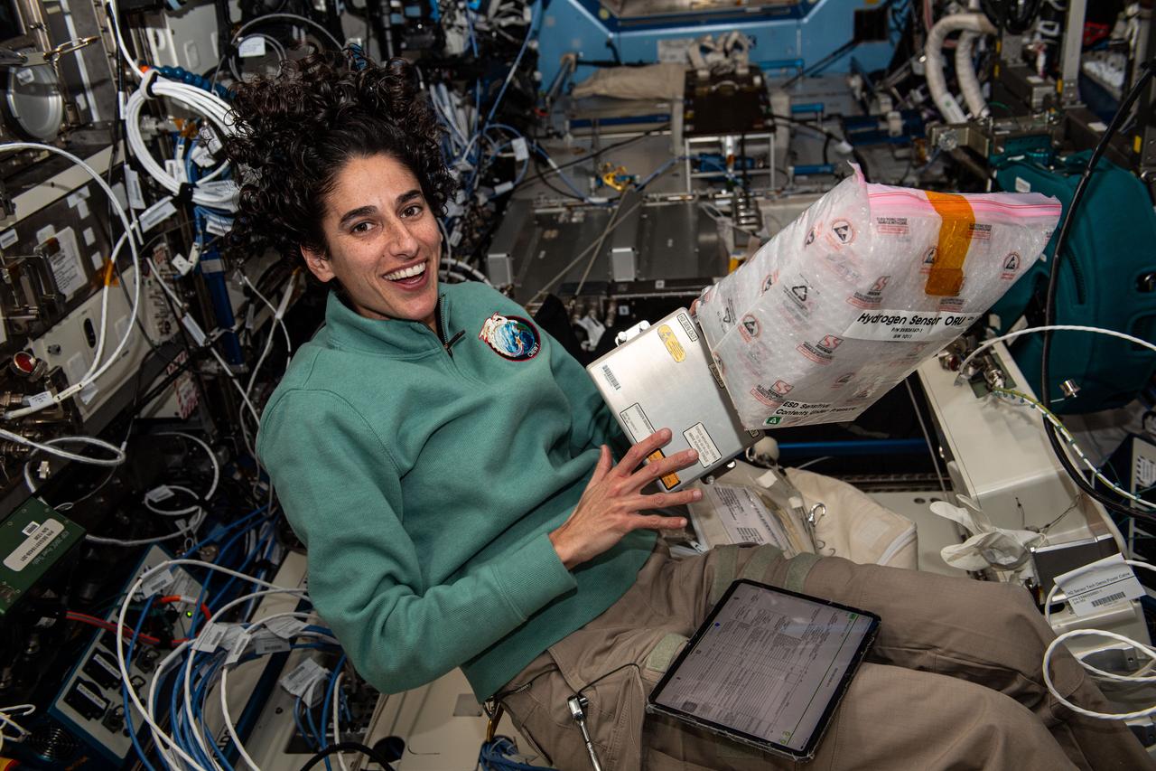 iss070e015796 (Nov. 3, 2023) --- NASA astronaut and Expedition 70 Flight Engineer Jasmin Moghbeli smiles for portrait while installing a new hydrogen sensor on an oxygen generator located inside the International Space Station's Destiny laboratory module.