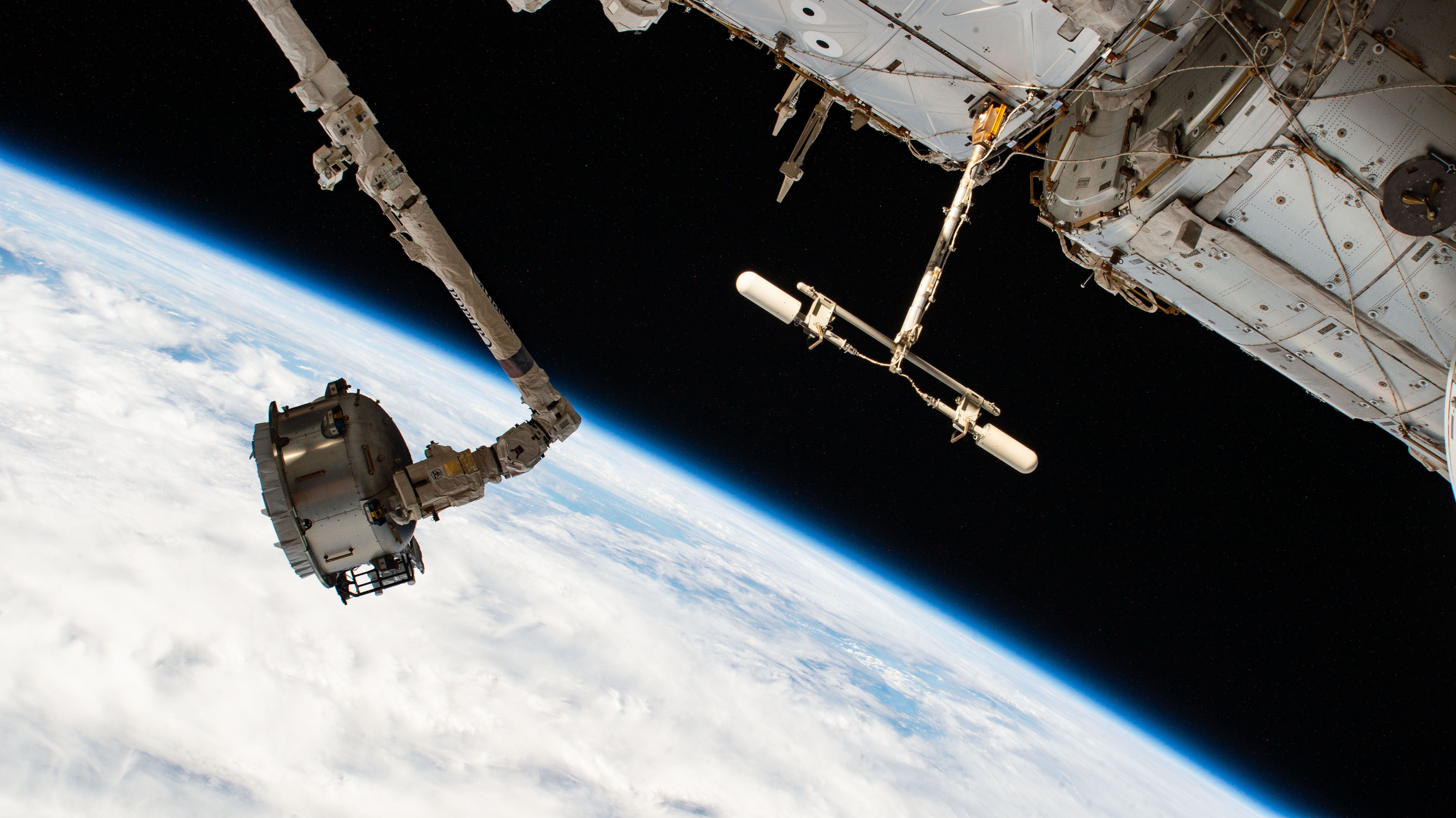 iss070e098229 (Feb. 22, 2024) --- At left, the Canadarm2 robotic arm maneuvers the NanoRacks Bishop airlock in the grip of its latching end effector. At top right, a UHF antenna extends from the forward end of the Destiny laboratory module, which is also attached to the Harmony module.