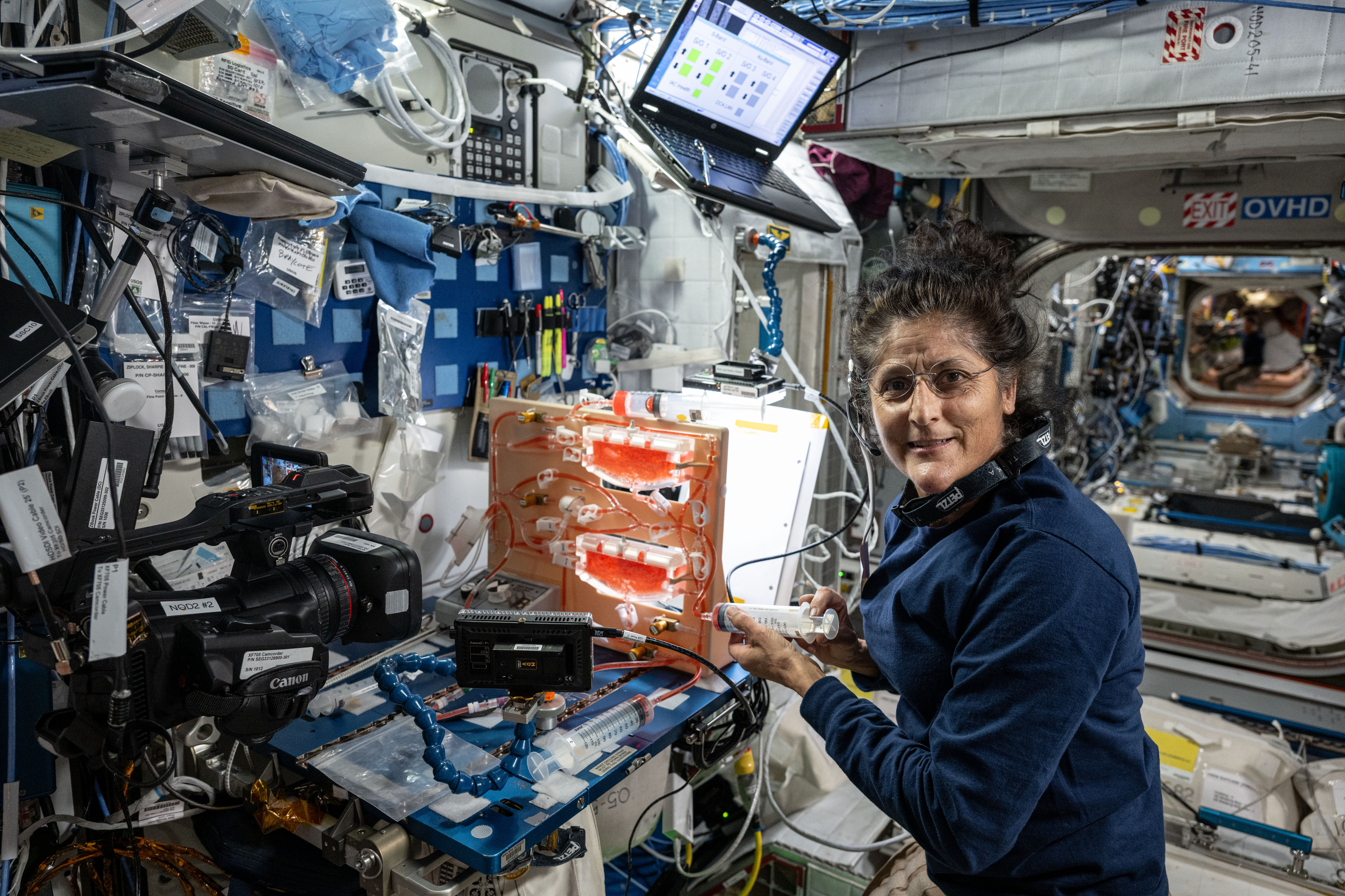iss071e356678 (July 16, 2024) --- NASA astronaut and Boeing Crew Flight Test Pilot Suni Williams investigates using fluid physics techniques such as surface tension, as well as hydroponics and air circulation, to overcome the lack of gravity when watering and nourishing plants grown in space. The Plant Water Management investigation uses facilities in the International Space Station's Harmony module to promote space agricultural activities on spacecraft and space habitats.