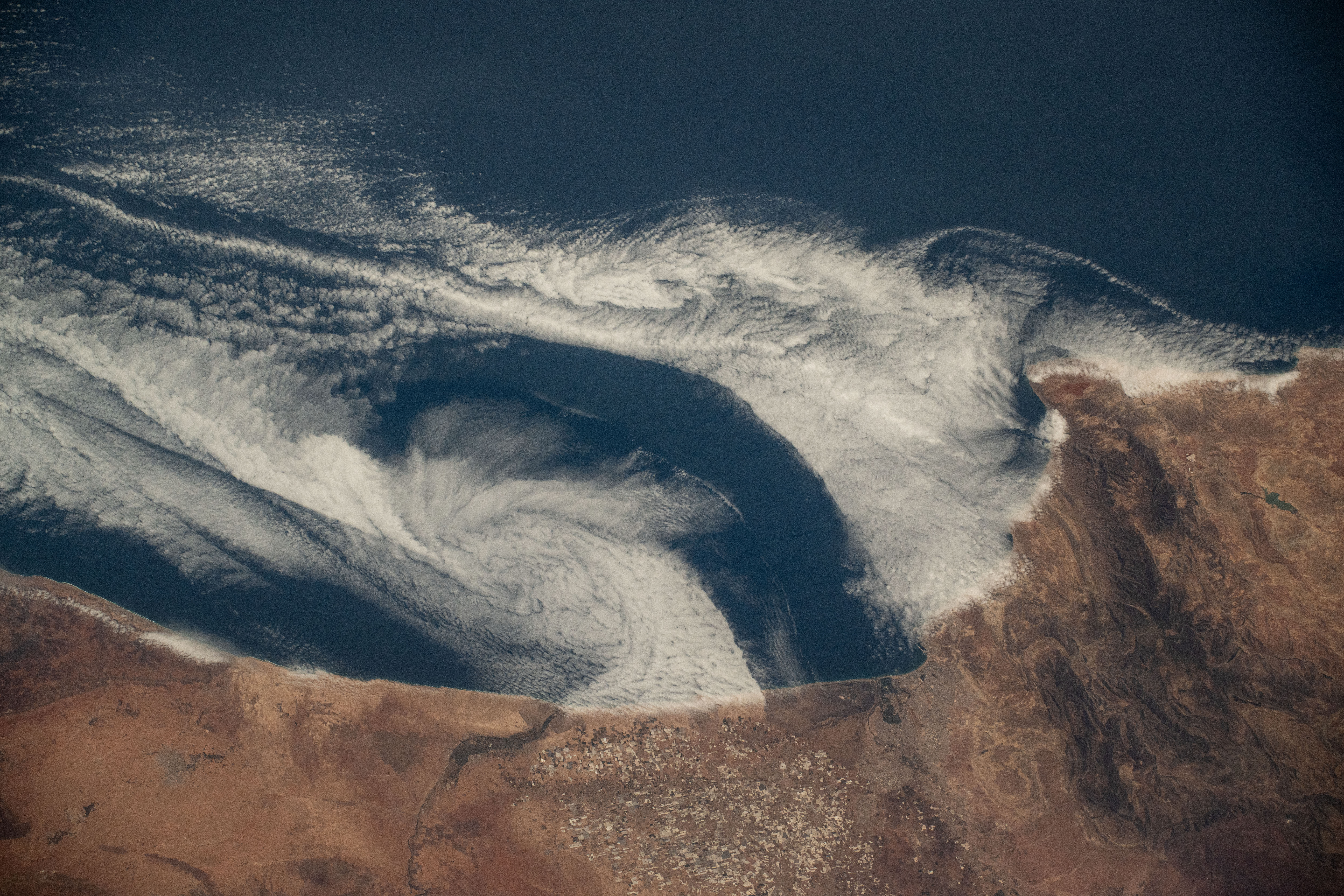 iss071e414090 (July 30, 2024) -- Clouds swirl into the coast of Morocco, hanging low over the Atlantic Ocean, as the International Space Station orbited 258 miles above.