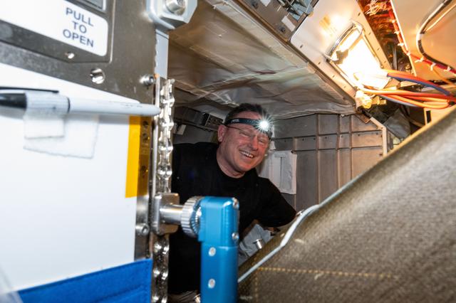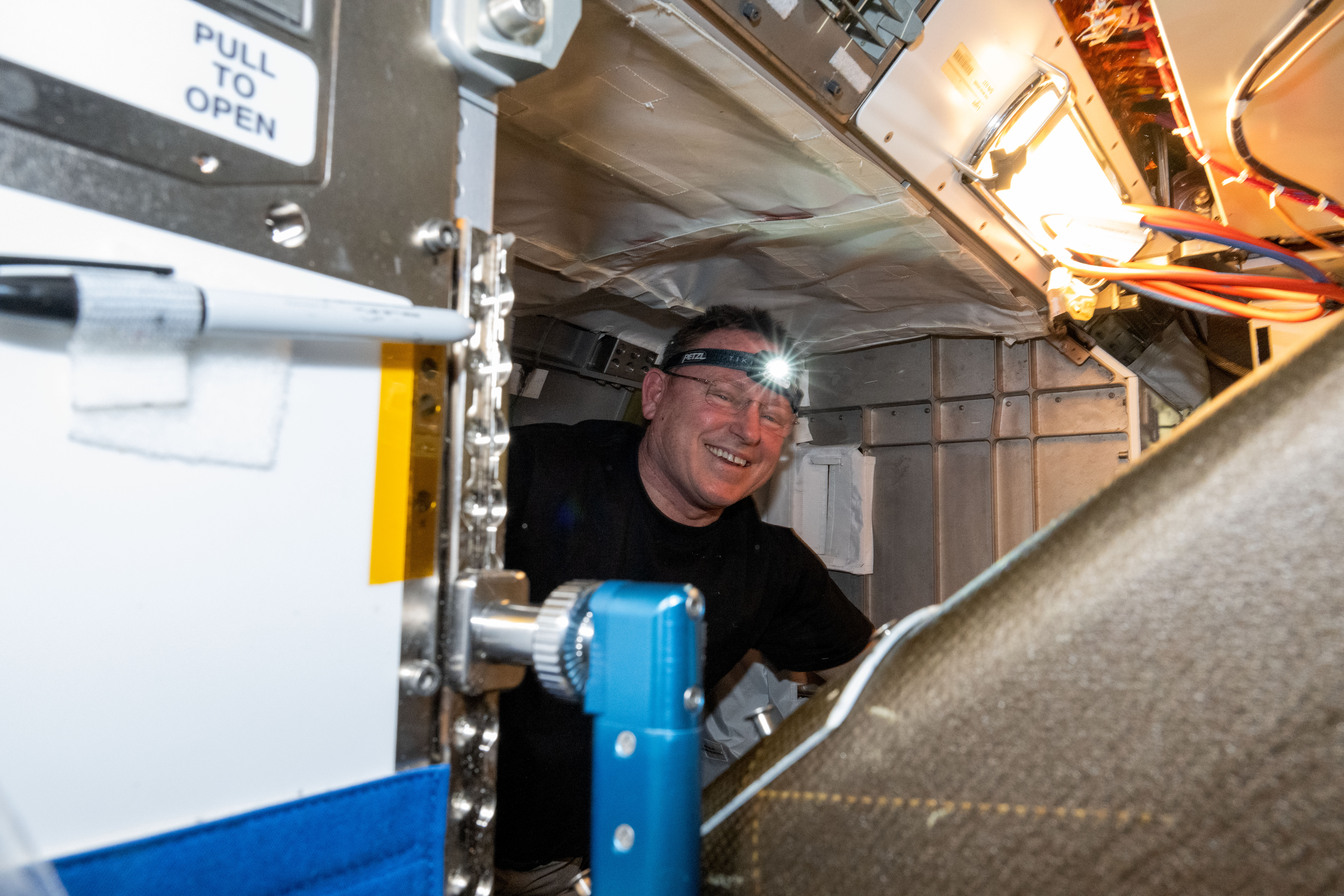 iss071e580589 (Aug. 27, 2024) --- Veteran NASA astronaut Butch Wilmore, who has launched to the International Space Station on three different spacecraft (Space Shuttle Atlantis, Soyuz TMA-14, and Boeing's CST-100 Starliner), services life support hardware located in the Tranquility module’s Air Revitalization System rack.