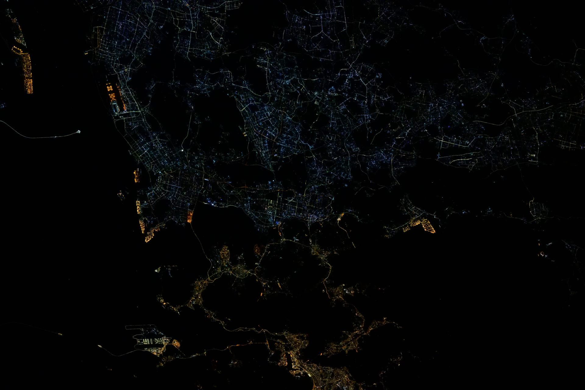 iss072e399613 (Dec. 20, 2024) --- The city lights of Hong Kong (bottom center) and Shenzhen, China, are different colors due to their historical differences. Shenzhen is a younger, more futuristic city, while Hong Kong is an older city illuminating its historical landmarks and its harbor. The International Space Station was orbiting 255 miles above southeastern China at the time of this photograph.