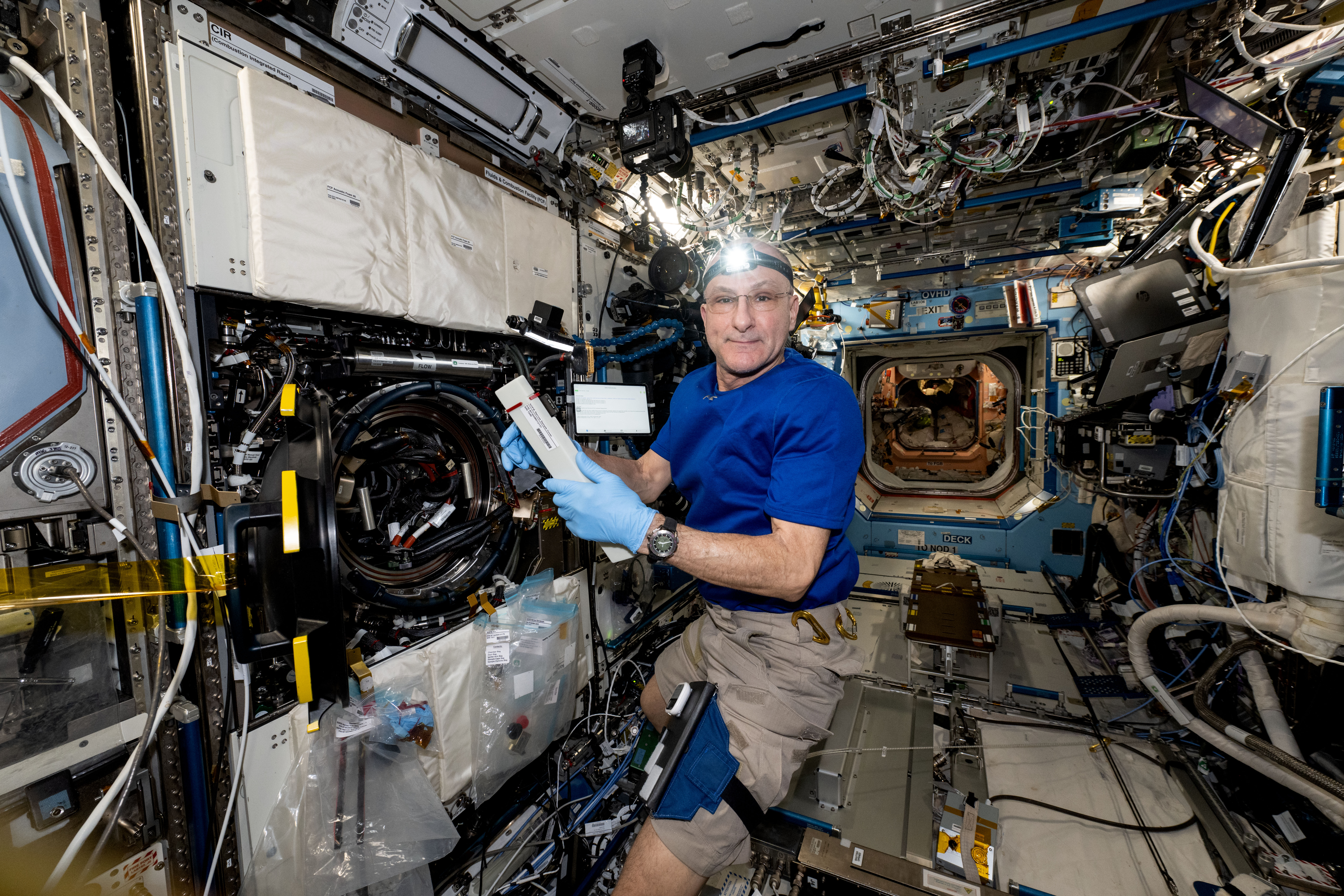 iss072e451296 (Jan. 8, 2025) --- NASA astronaut and Expedition 72 Flight Engineer Don Pettit works in the Destiny laboratory module's Combustion Integrated Rack swapping samples of materials to observe how they burn in weightlessness. The investigation taking place inside the International Space Station's CIR enables the safe observation of flames and how they spread in microgravity potentially improving fire safety on crew missions.