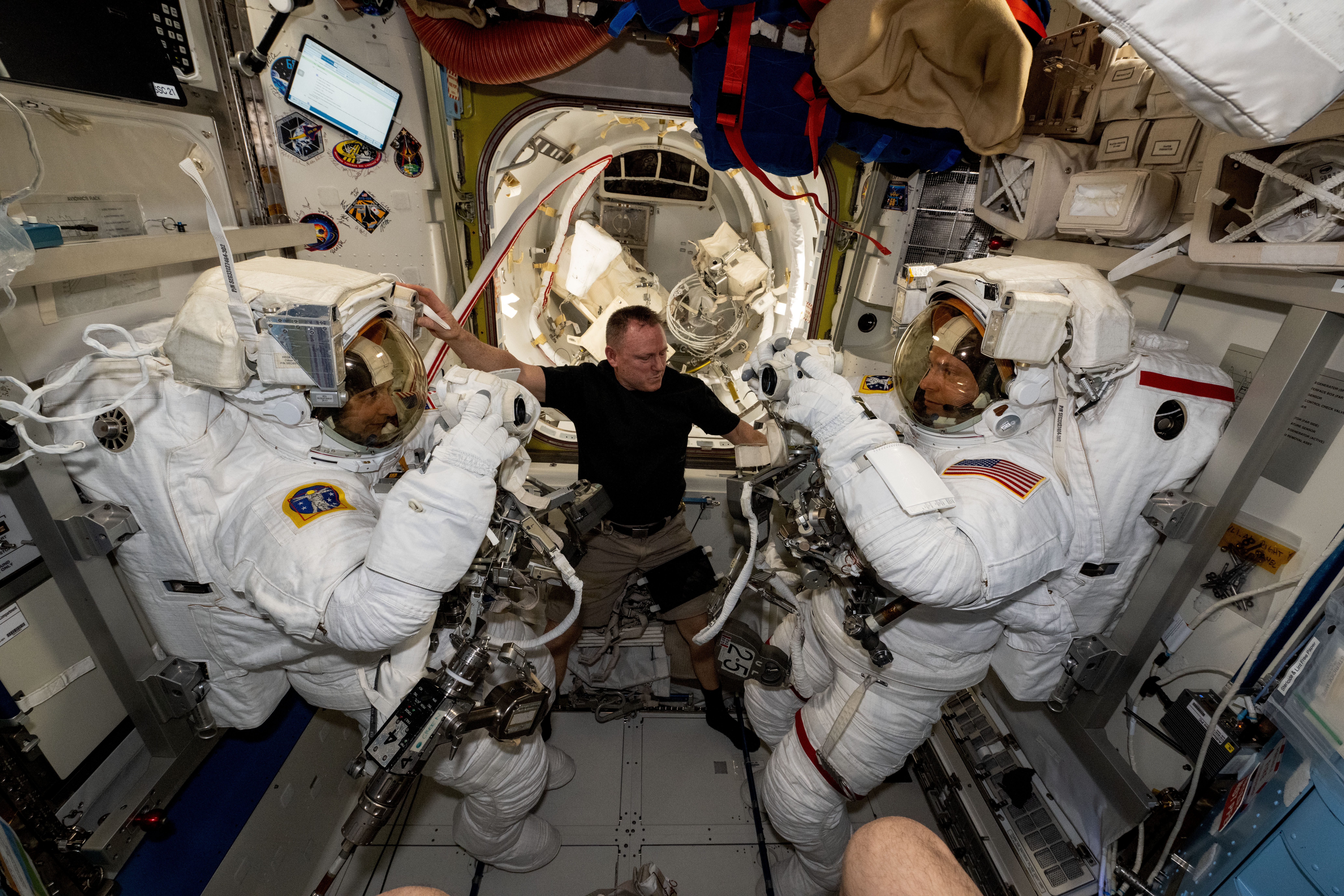 iss072e451687 (Jan. 9, 2025) --- NASA astronaut and Expedition 72 Flight Engineer Butch Wilmore (center) assists International Space Station Commander Suni Williams (left) and Flight Engineer Nick Hague (right), both NASA astronauts, as they prepare to evaluate their spacesuits in a pressurized configuration. Hague and Williams are scheduled to exit the orbital outpost on Jan. 16 for a spacewalk to service astrophysics gear including the NICER X-ray telescope and the Alpha Magnetic Spectrometer.