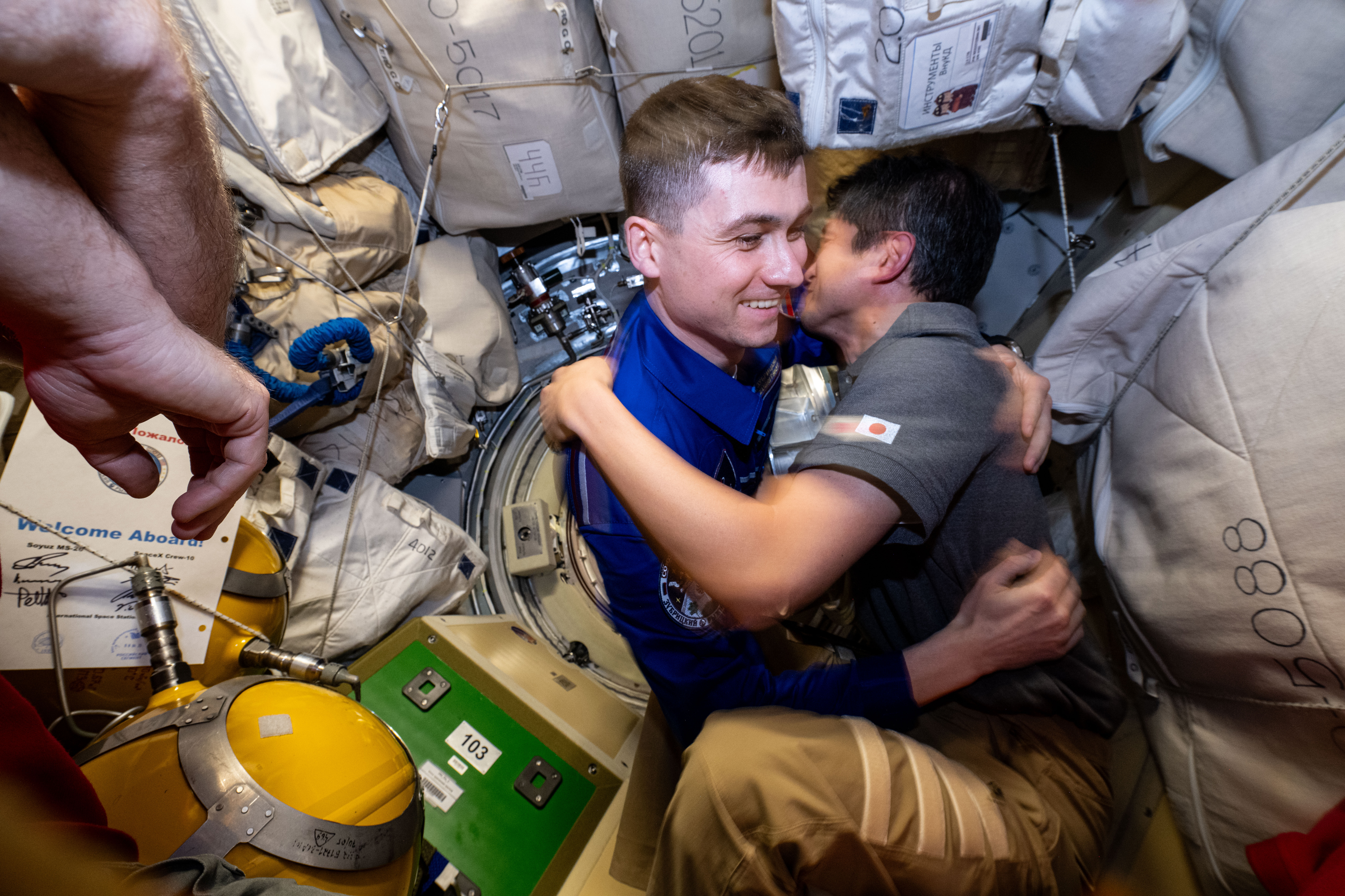 iss072e939999 (April 8, 2025) --- Roscosmos cosmonaut and Expedition 72 Flight Engineer Alexey Zubritsky enters the International Space Station shortly after docking to the Prichal module aboard the Soyuz MS-27 spacecraft. Flight Engineer Takuya Onishi of JAXA (Japan Aerospace Exploration Agency), at right, greets Zubritsky with a hug.