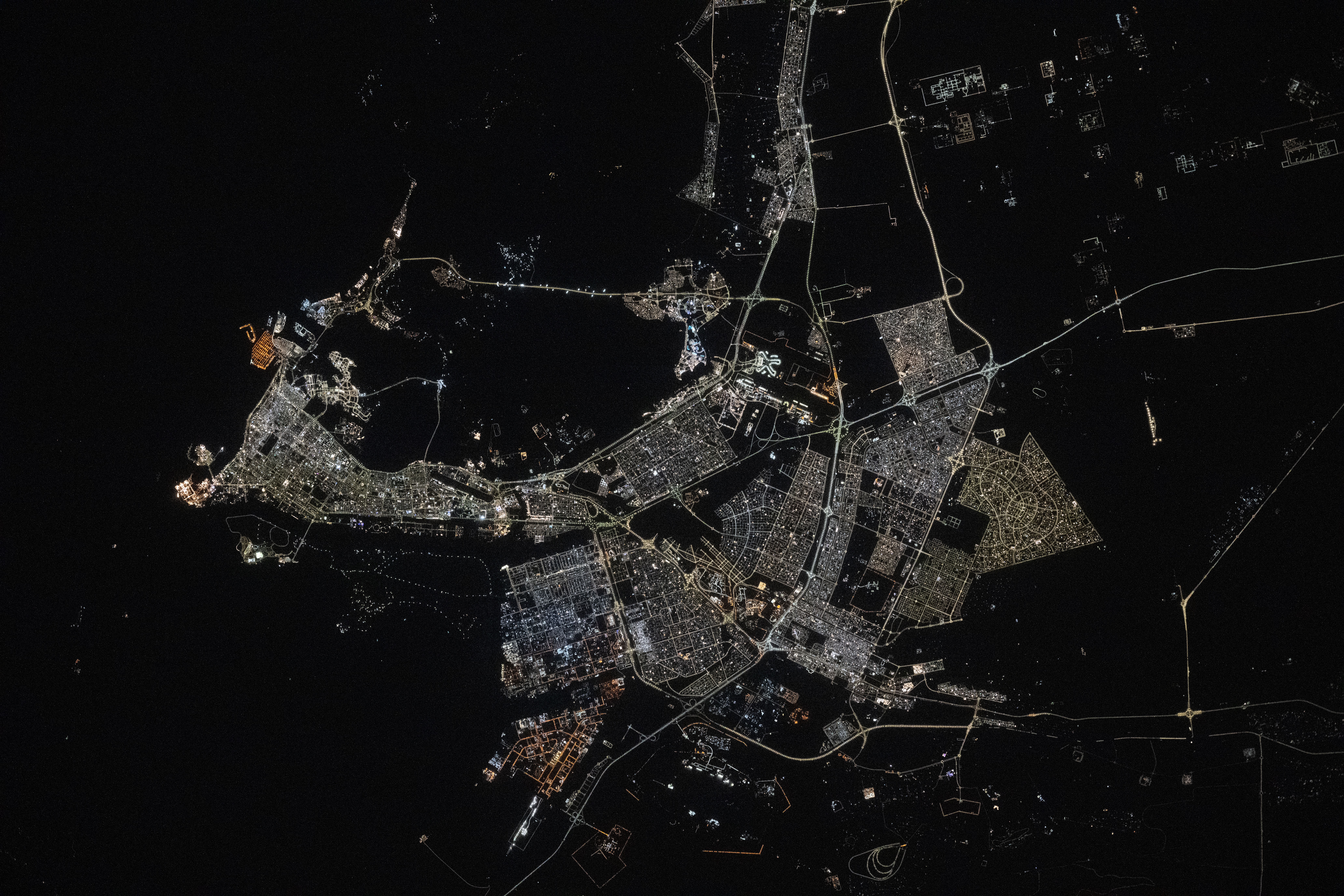 iss073e0134580 (May 22, 2025) --- Abu Dhabi, the capital and second most populous city in the United Arab Emirates with a population of about 1.57 million on the Persian Gulf, is pictured at approximately 10:44 p.m. local time from the International Space Station as it orbited 259 miles above the Middle East.