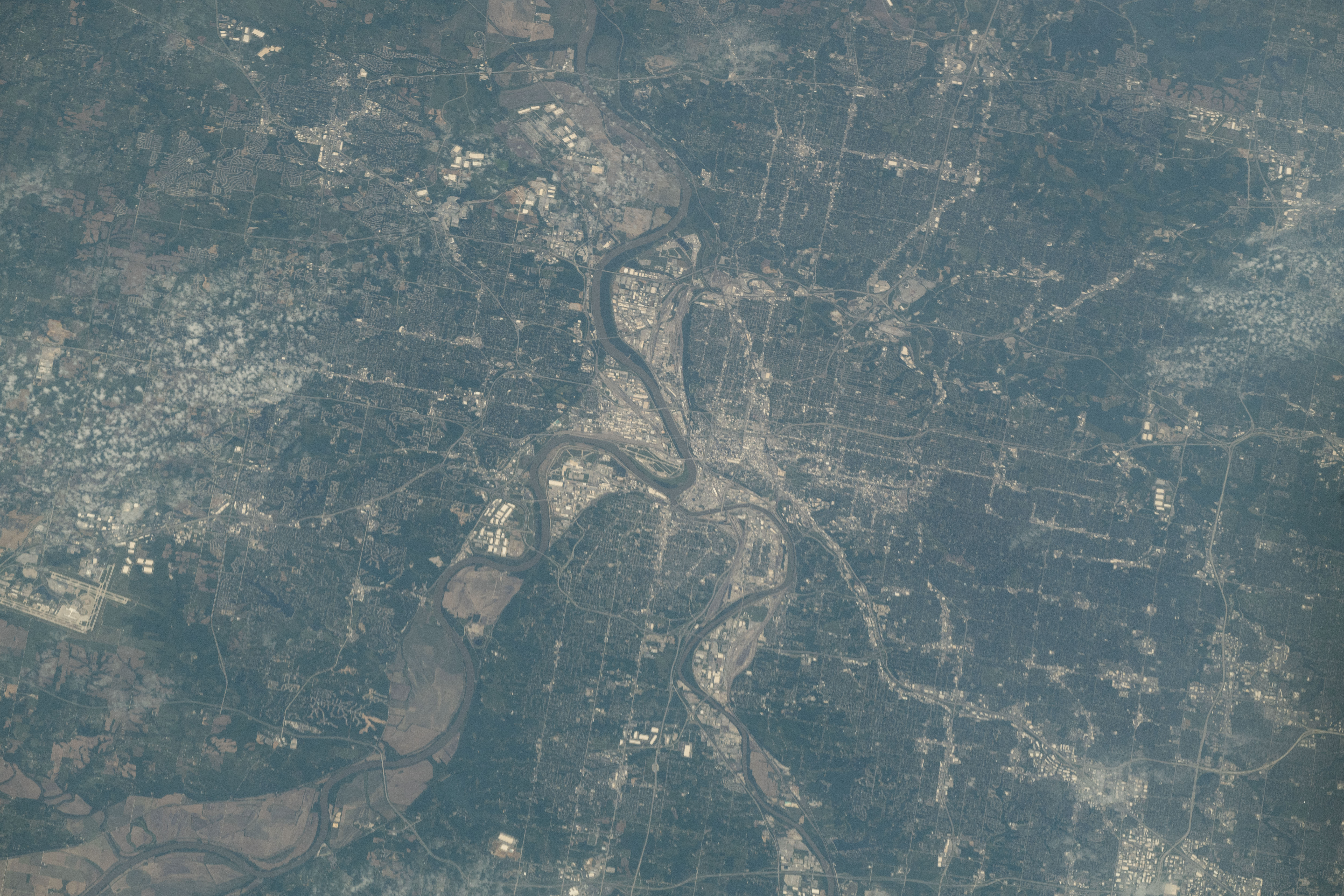 iss073e0134680 (May 31, 2025) --- Kansas City, the largest city in Missouri with a population of about 516,000 and split by the Missouri River, is pictured from the International Space Station as it orbited 262 miles above the midwestern United States.