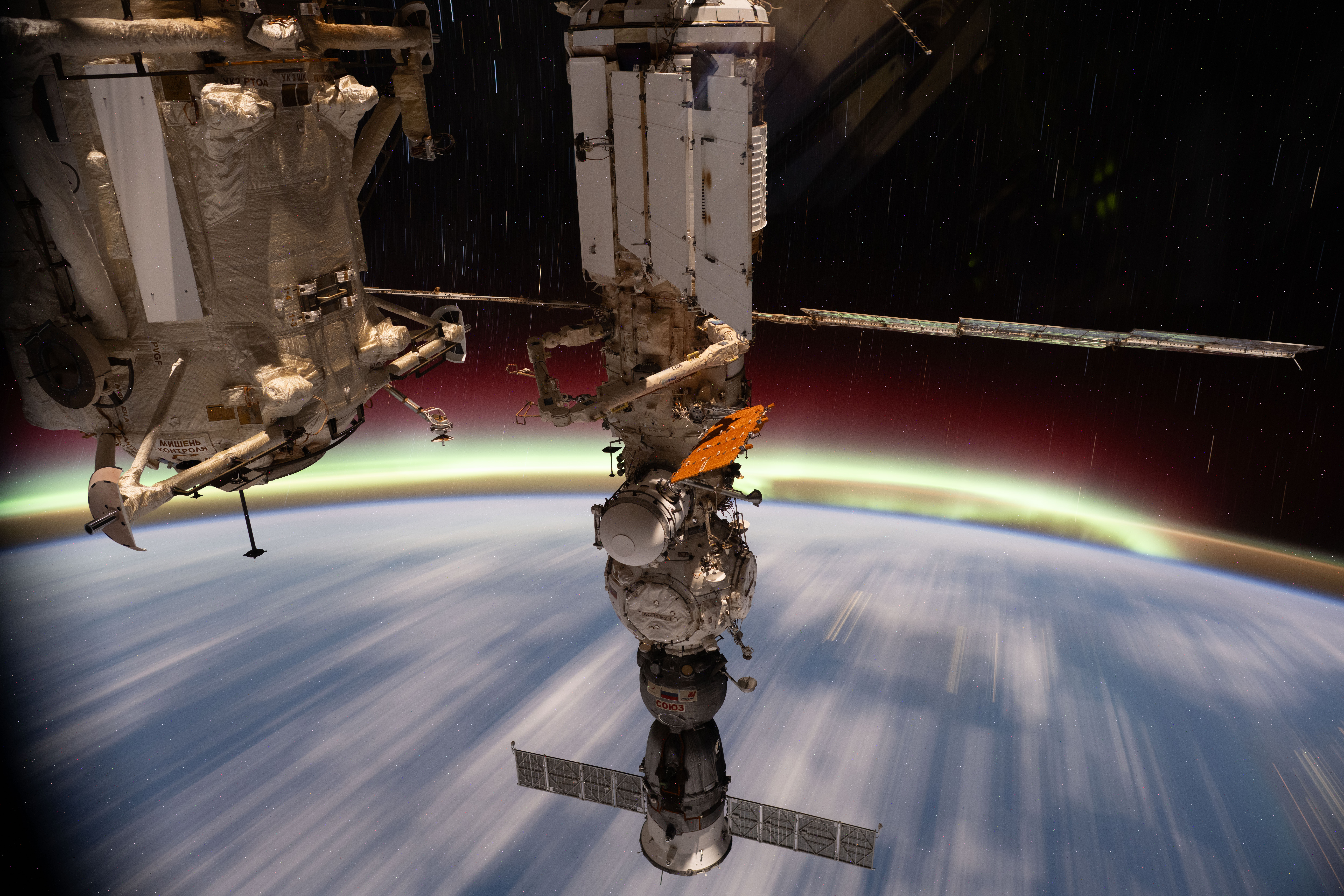 iss073e0608785 (June 13, 2025) --- The aurora australis streams above Earth's horizon in this long duration photograph taken from the International Space Station as it orbited 266 miles above the Tasman Sea off the coast of Sydney, Australia, at approximately 3:28 a.m. local time. Portions of the orbital outpost's Roscosmos segment are visible in the foreground, including (from left) the Rassvet module and the Soyuz MS-27 crew spacecraft docked to the Prichal module which is itself attached to the Nauka science module.